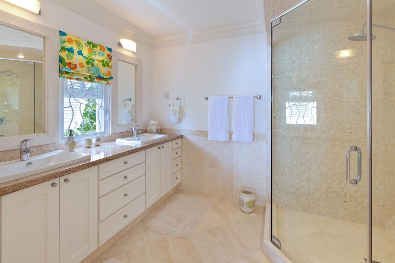 The upper level is home to all five bedrooms, with the master and bedroom 2 both opening to balconies overlooking the ocean and gardens. Each bedroom is air conditioned and incorporates gentle breeze from the ceiling fans. The upper level also hosts a small TV room.