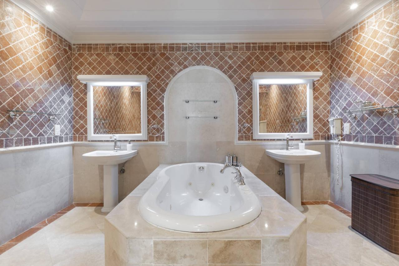 Bedroom 2: Two twin beds, ensuite bathroom with free standing tub and walk-in shower, ceiling fan, AC, garden view