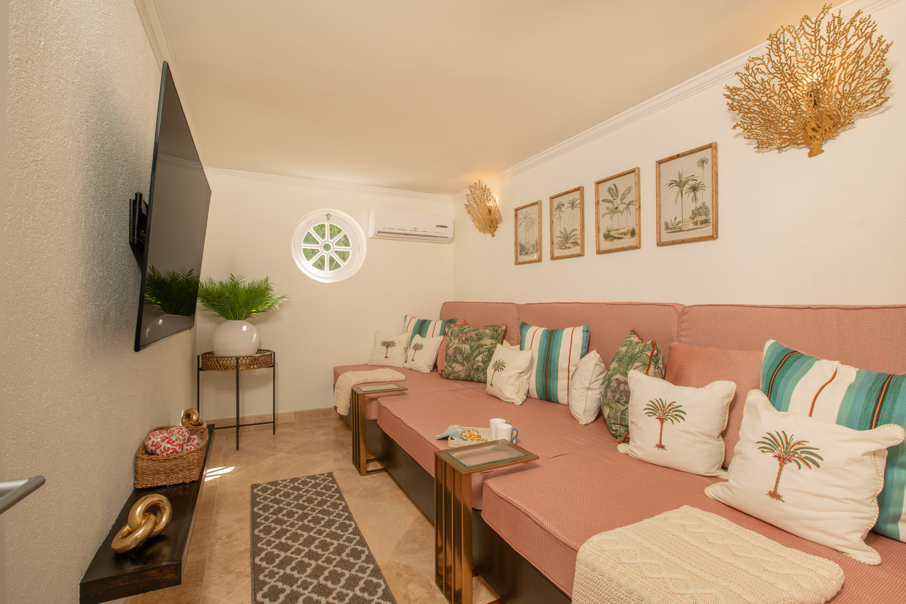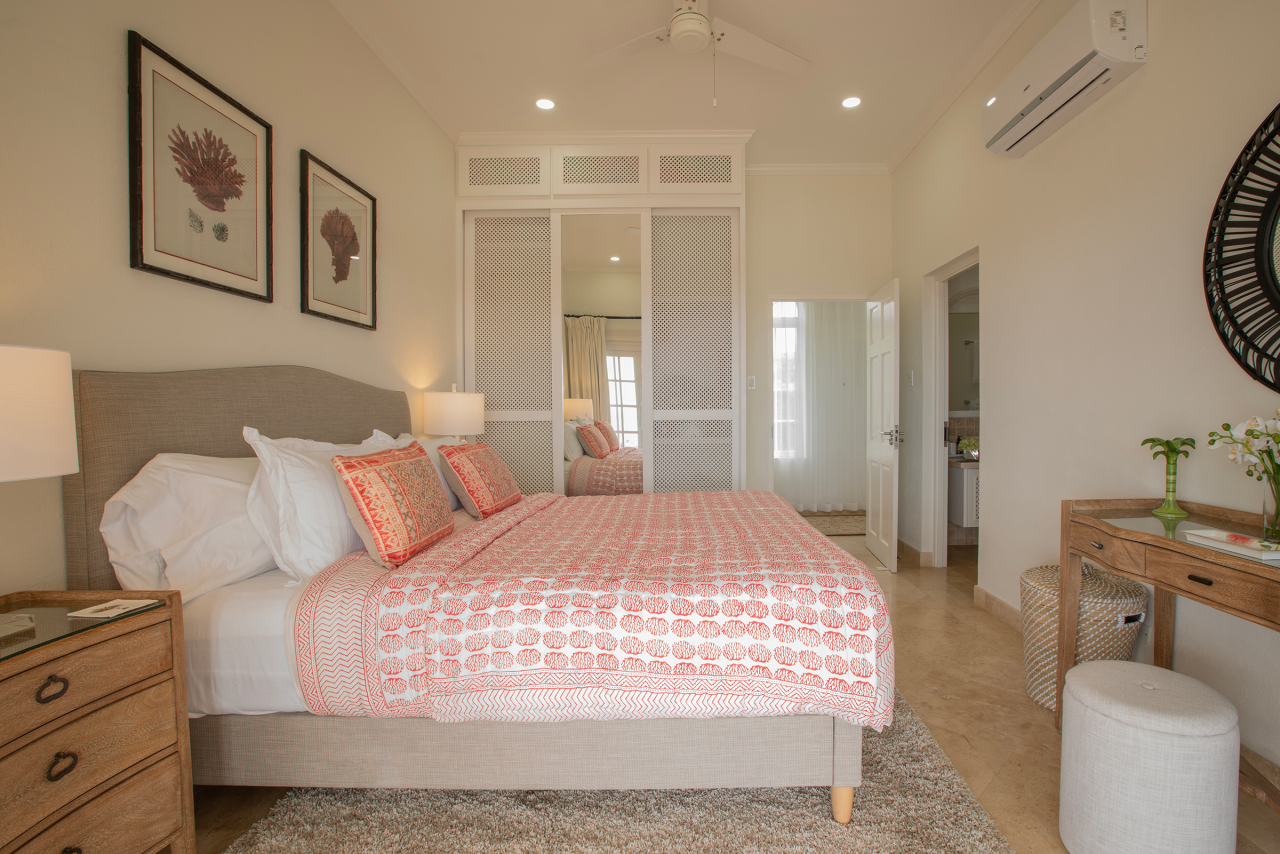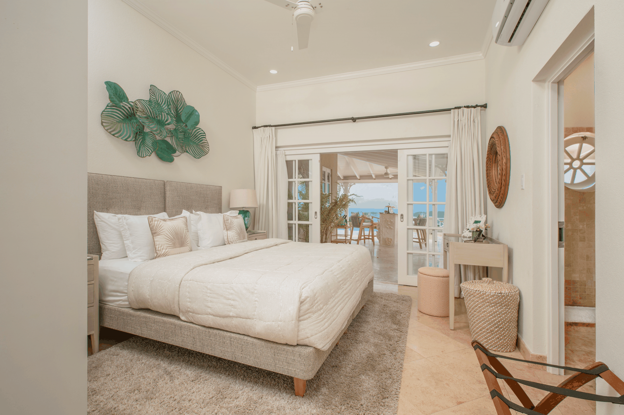 Primary Bedroom 2: This room is equipped with a king-sized bed, air conditioning, a ceiling fan, a safe, a sea view, and an ensuite bathroom with a freestanding bath and a rain shower head.