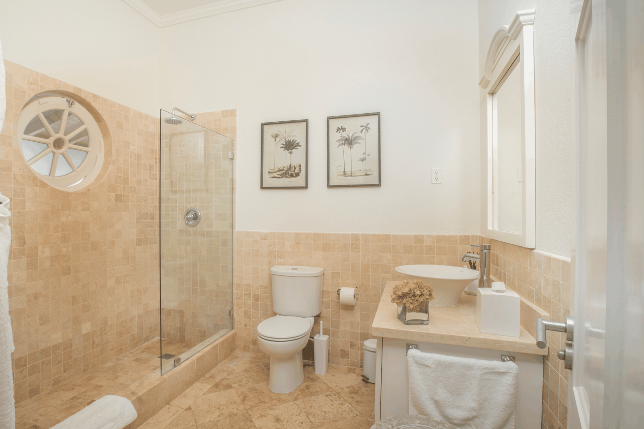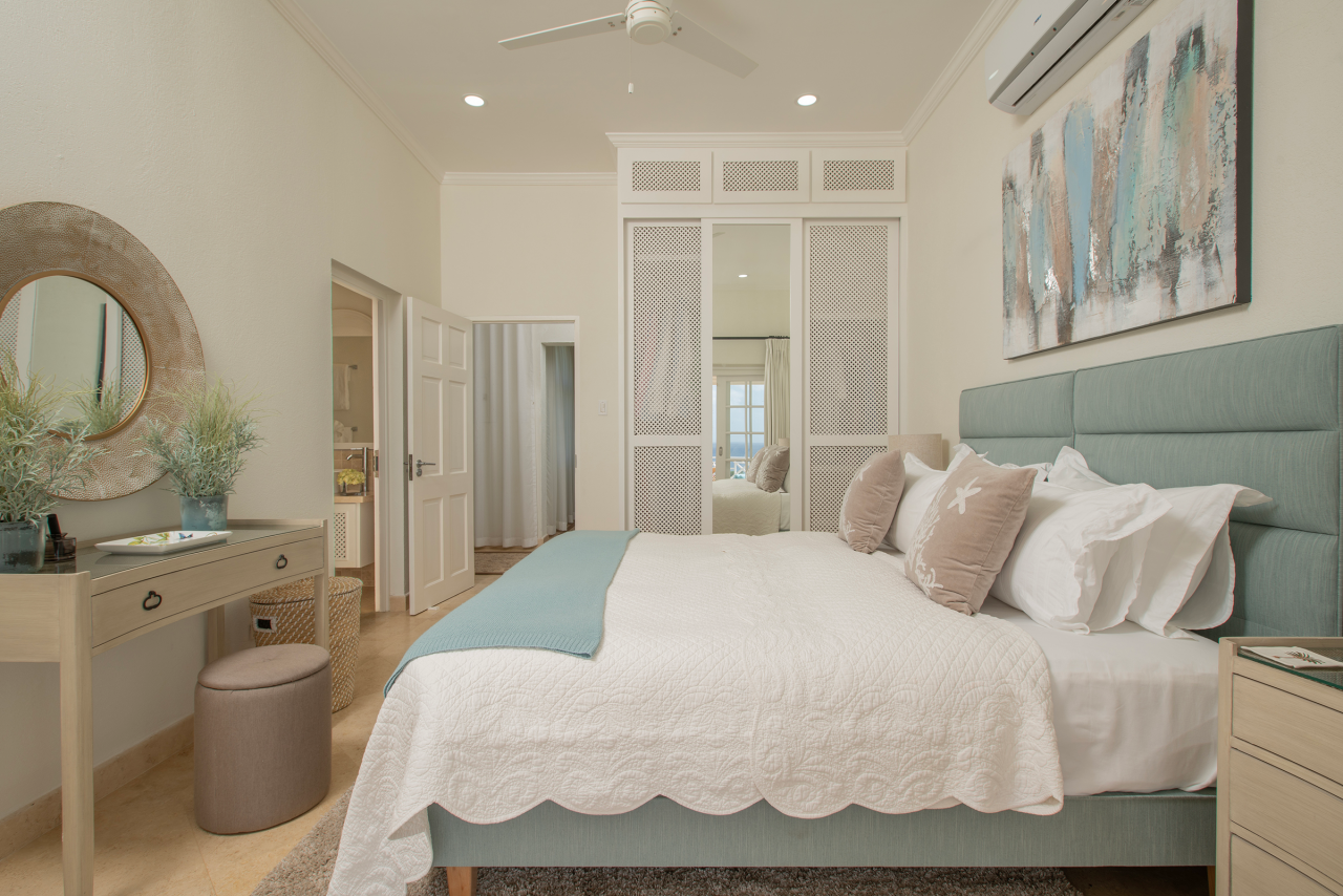 Bedroom 5: This room is equipped with a king-sized bed, air conditioning, a ceiling fan, a sea view, and an ensuite bathroom with a freestanding bath and a walk-in shower.