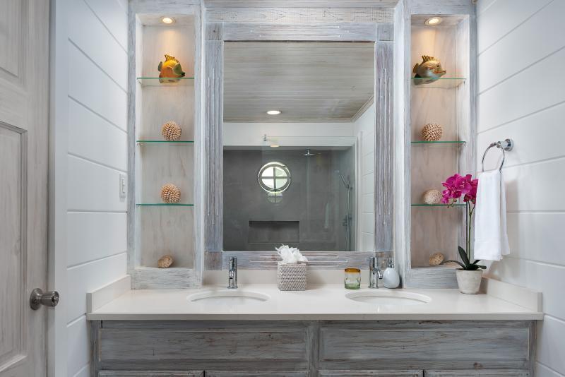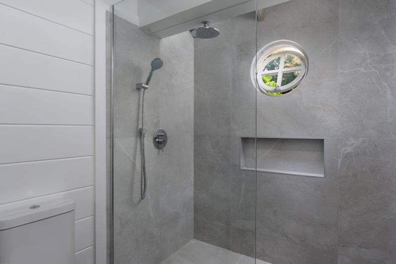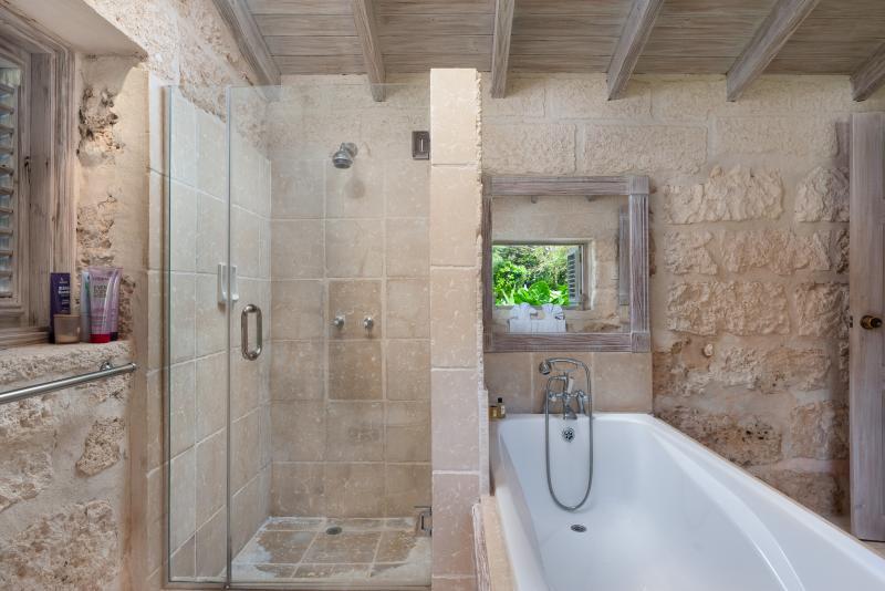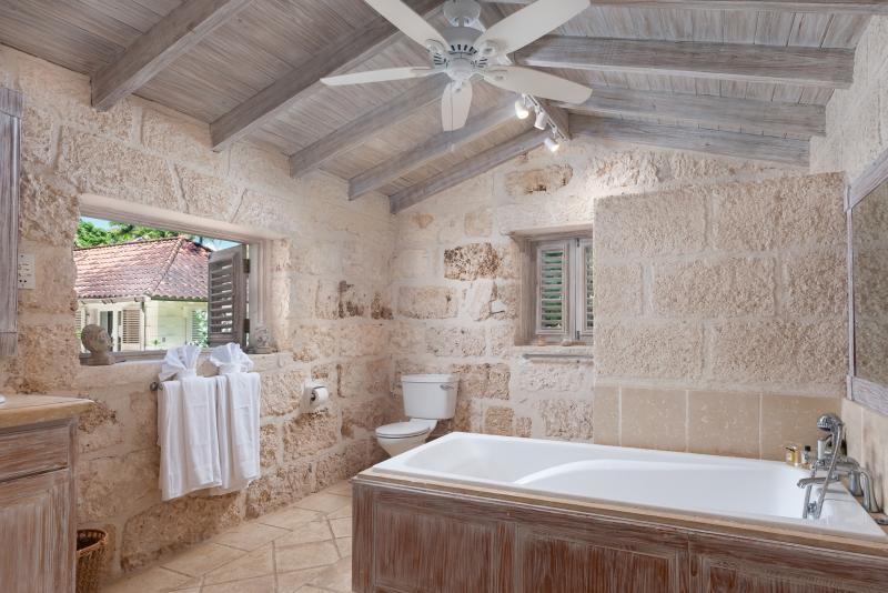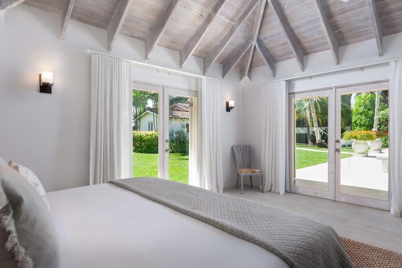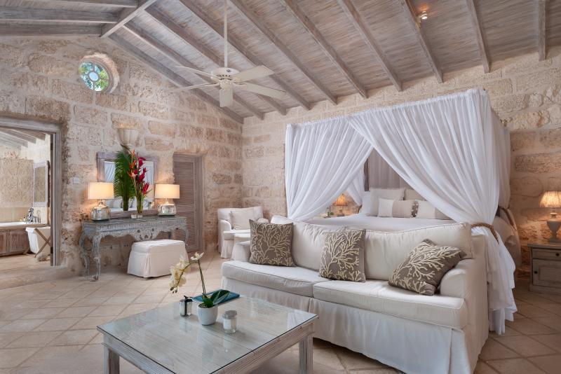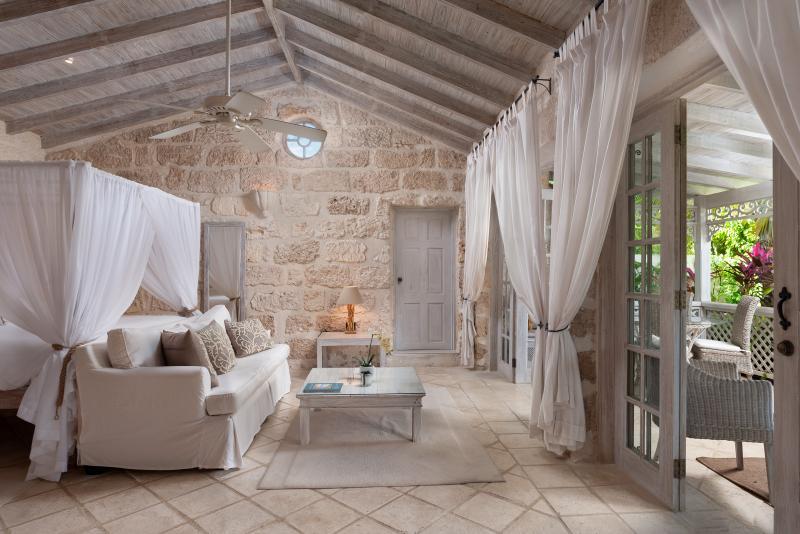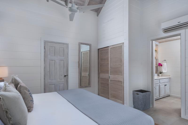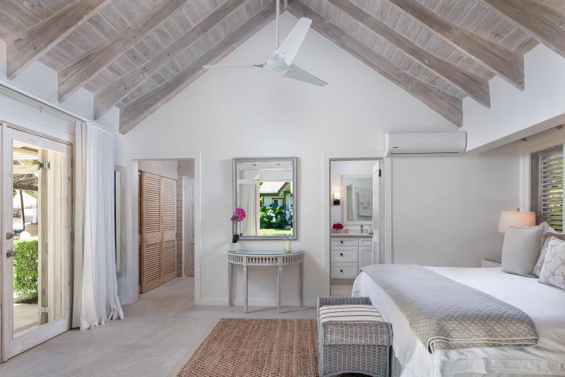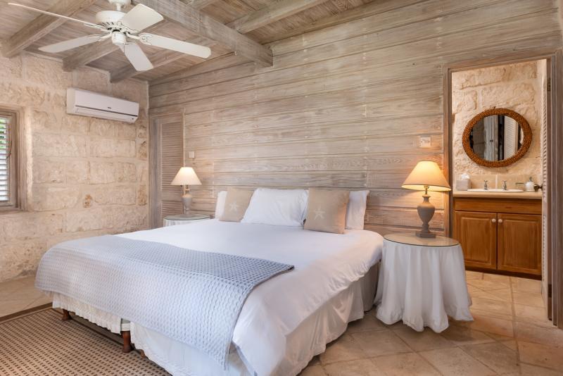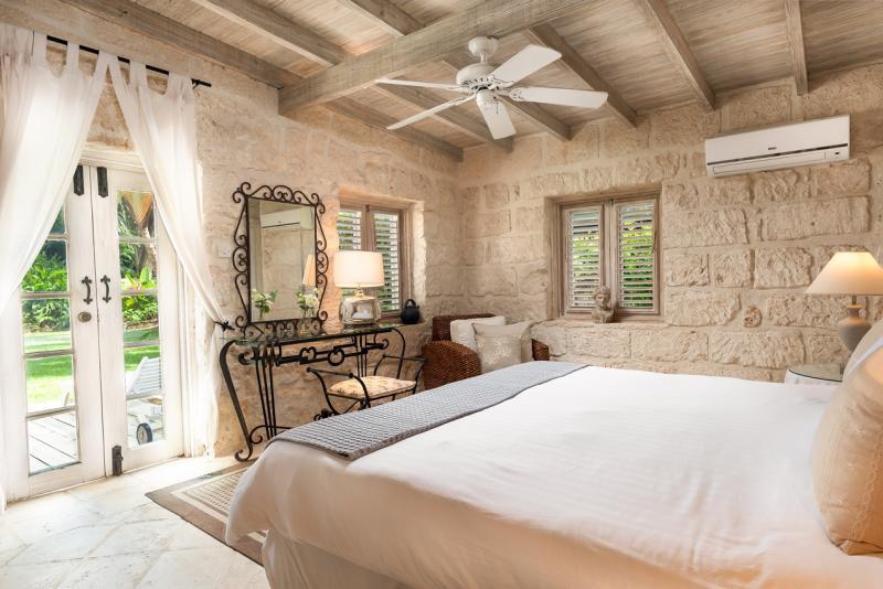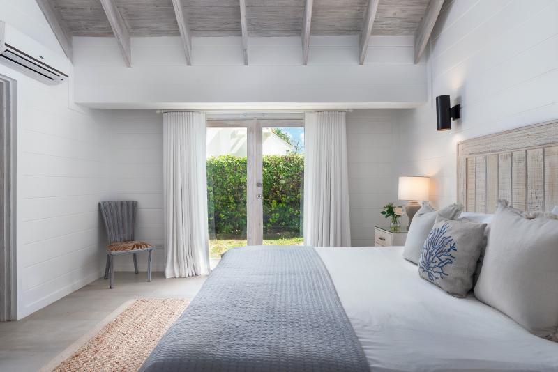 Cottage, Primary Bedroom: Views out onto the pool and bar, Air conditioned, En-suite tub and separate shower