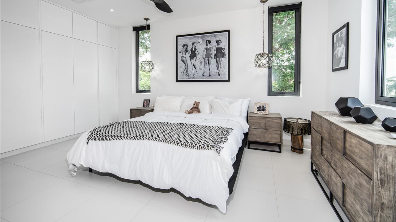 Primary Bedroom: This room has a king-sized bed, ensuite bathroom with toilet, shower, tub, and double vanities.