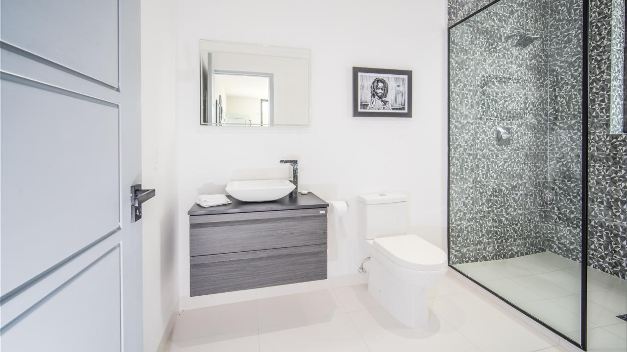 Bedroom 2: This room has a king-sized bed, ensuite bathroom with toilet, shower, and single vanity.