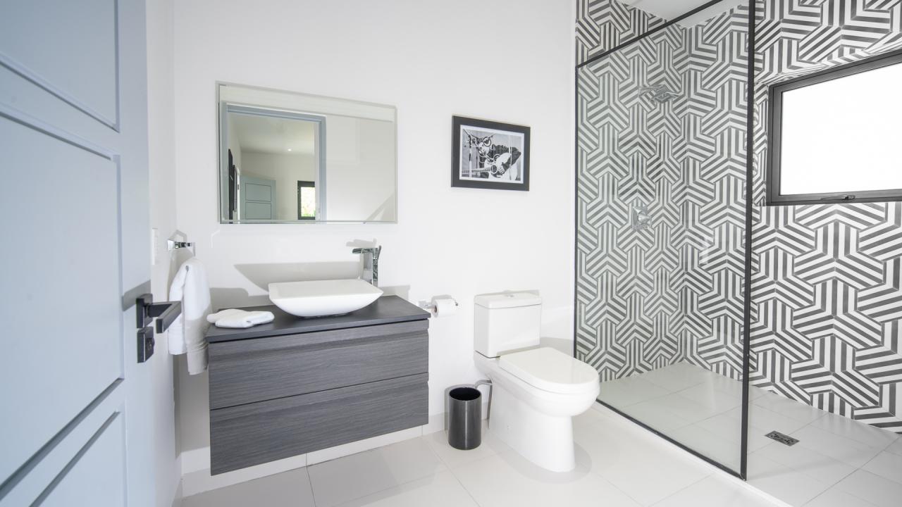 Bedroom 5: This room has a king-sized bed, ensuite bathroom with toilet, shower, and single vanity.