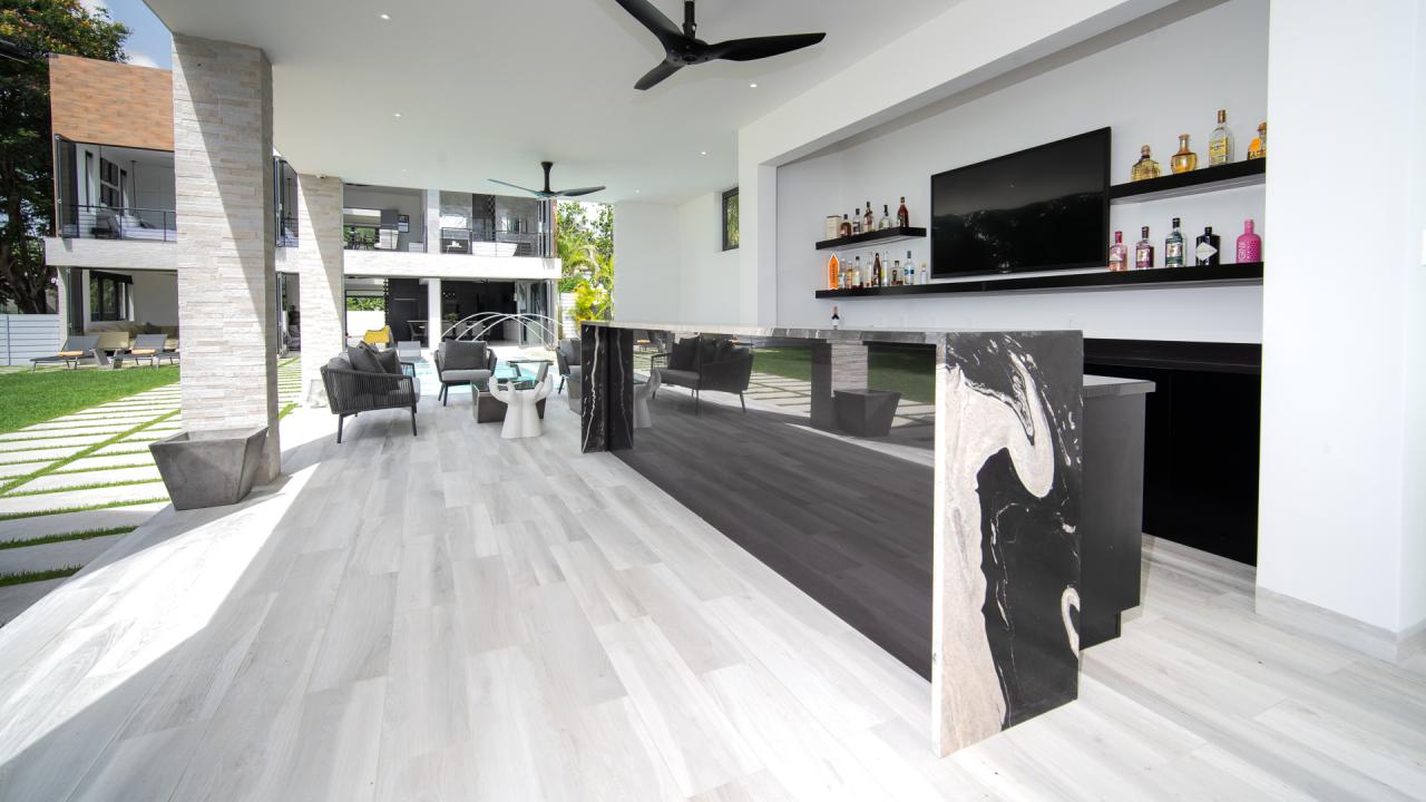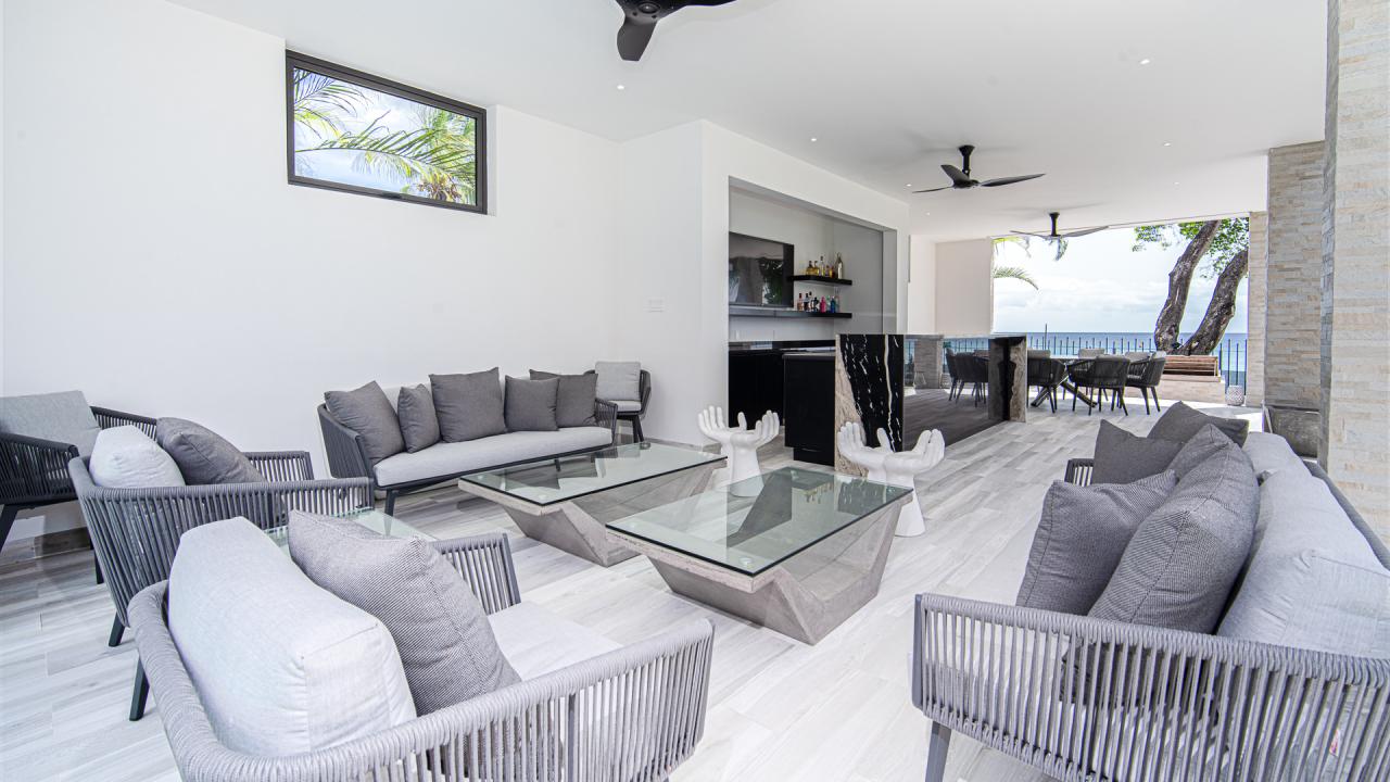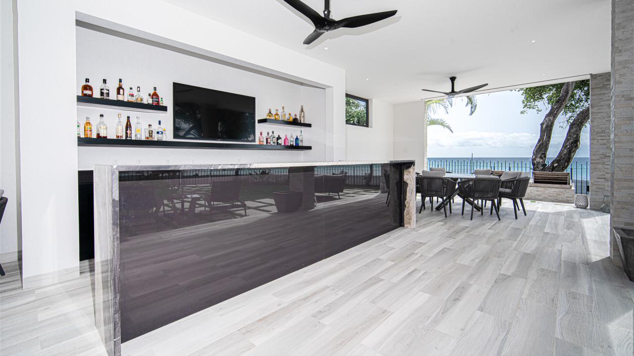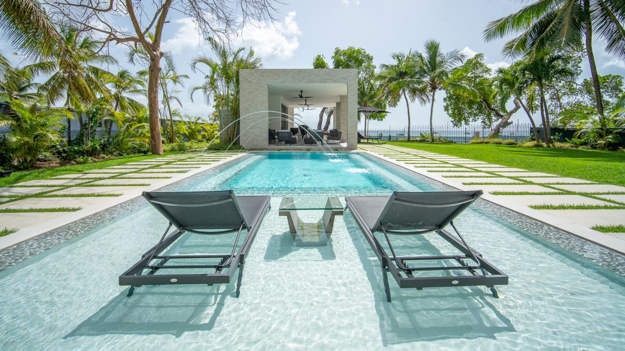 Villa Onyx offers a stunning pool and a shallow end of the pool with a table for wine or your preferred beverage or snack. Directly ahead is a modern entertainment pavilion with a TV, wine chiller, and plenty of seating. The pavilion at this Barbados villa rental resembles an upscale outdoor bar and is cooled by ceiling fans and sea breezes. Villa Onyx provides direct beach access to a sinfully gorgeous white sand beach. Villa Onyx is a short drive away from popular restaurants and shops. Villa Onyx is the ultimate Barbados vacation rental.