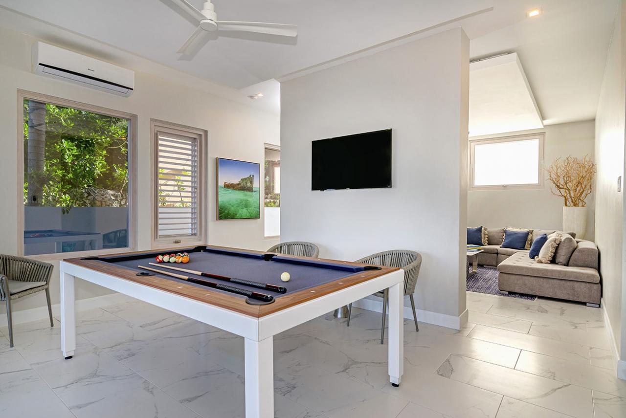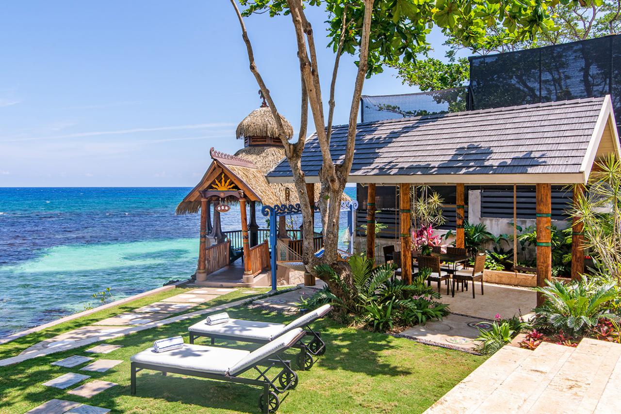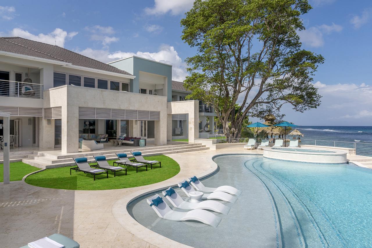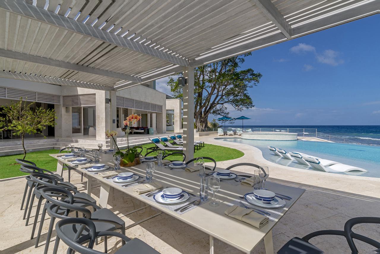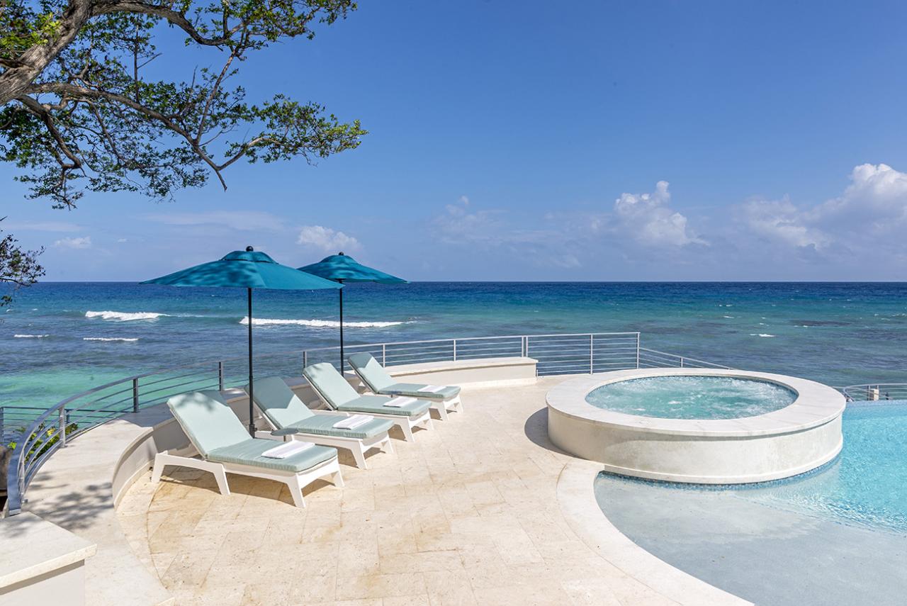 This Jamaica villa and cottage rental are the epitomai of ocean edge living. The sitting room is sunken which benefits from wide openings to the veranda. There is a custom artisanal dining table that is made from one piece of Tamarind that can seat 18 guests. The villa offers an air-conditioned game room that leads to the media room that is equipped with large comfortable sofas and an 85" flat-screen TV.