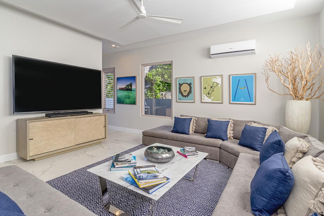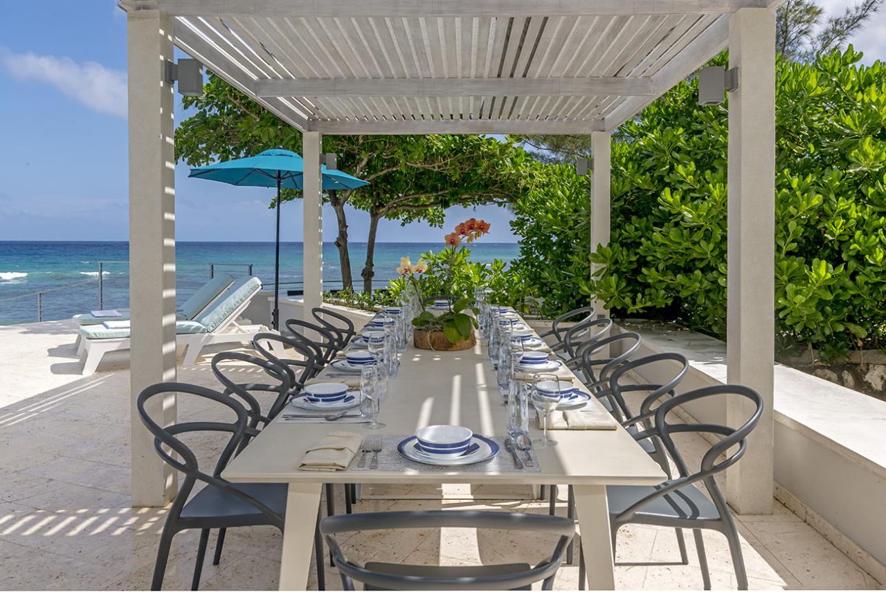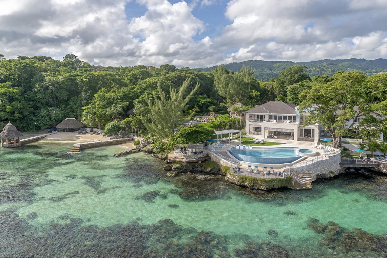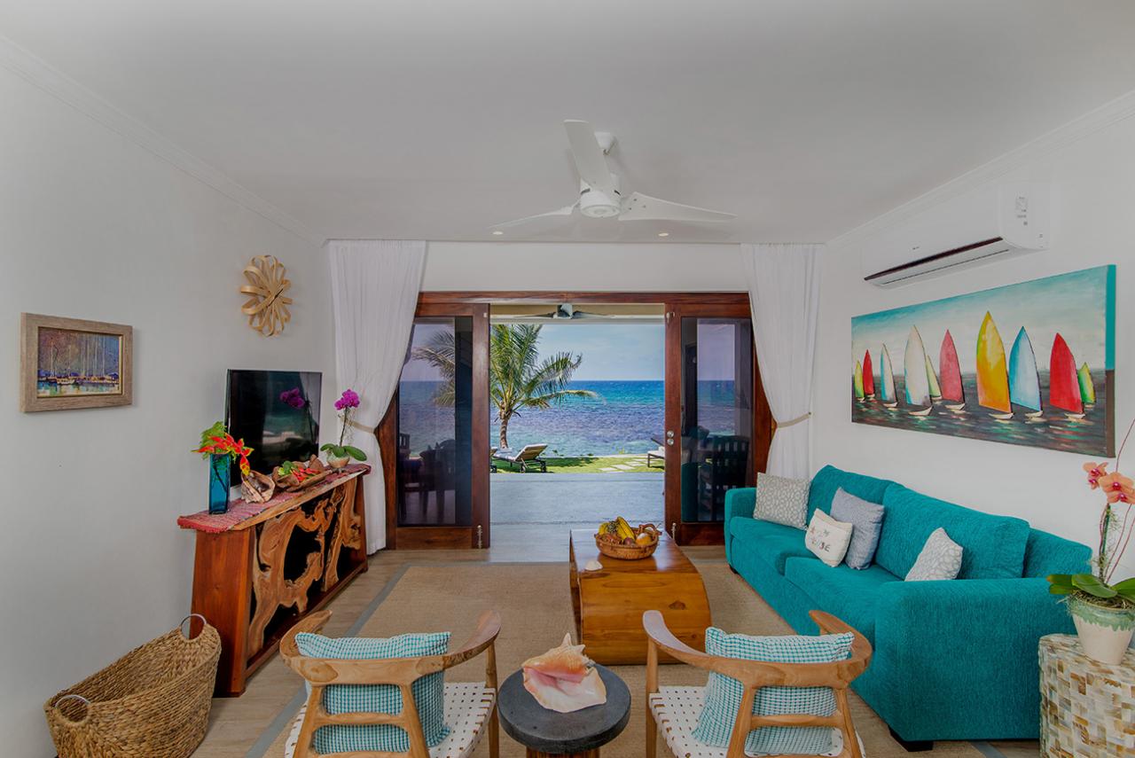 This Jamaica villa and cottage rental are the epitomai of ocean edge living. The sitting room is sunken which benefits from wide openings to the veranda. There is a custom artisanal dining table that is made from one piece of Tamarind that can seat 18 guests. The villa offers an air-conditioned game room that leads to the media room that is equipped with large comfortable sofas and an 85" flat-screen TV.