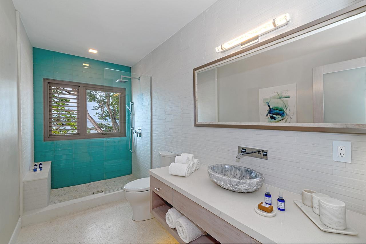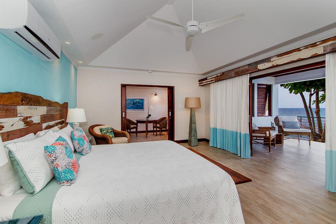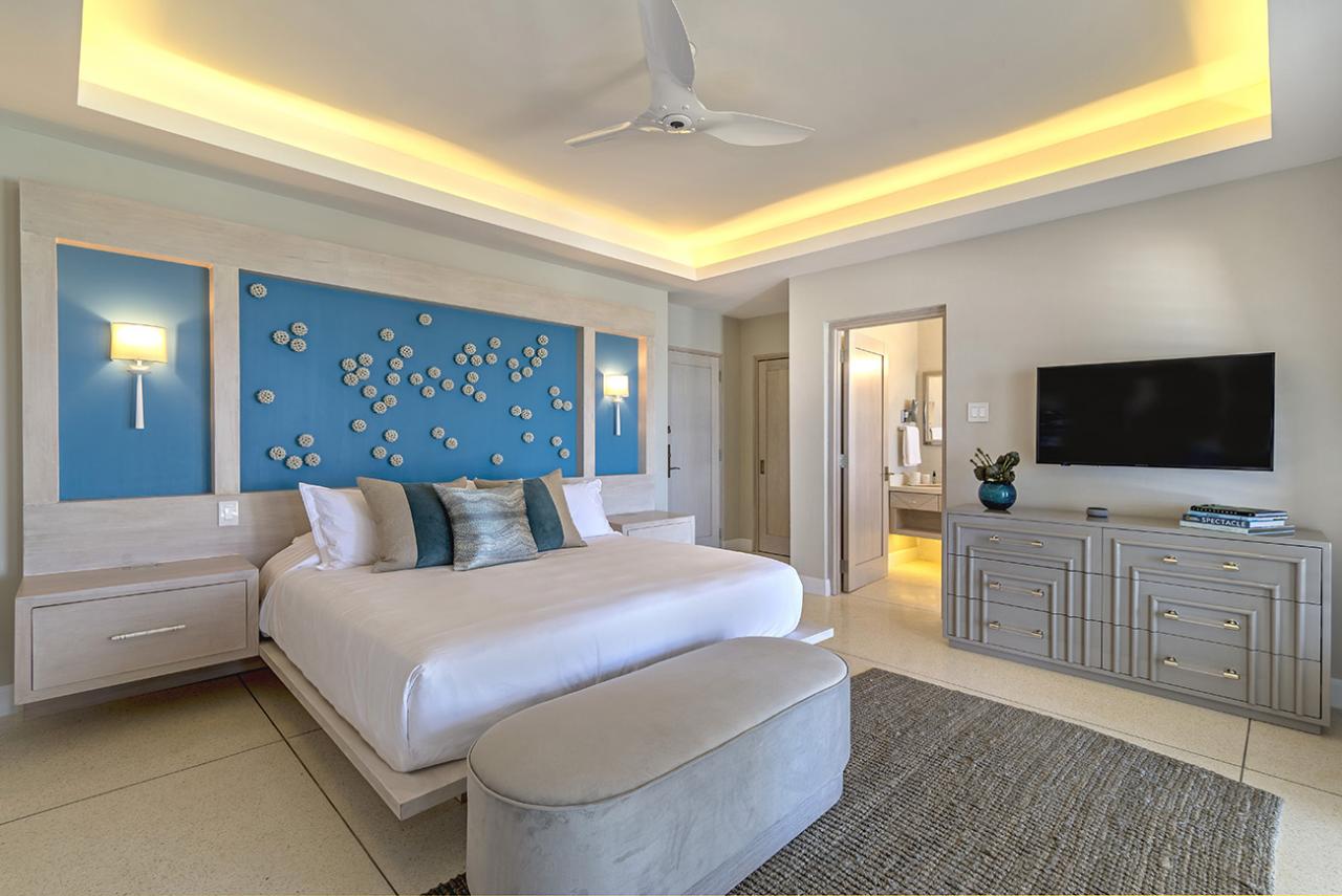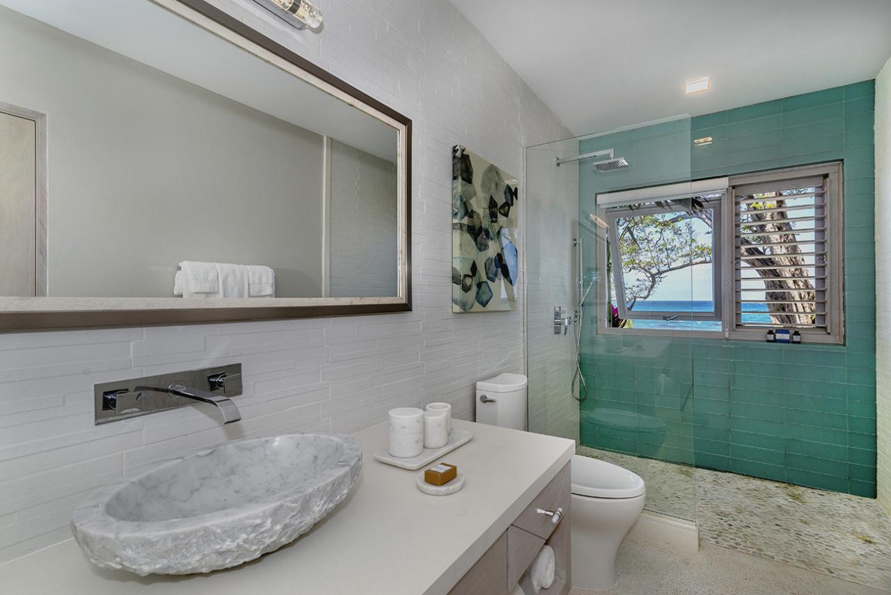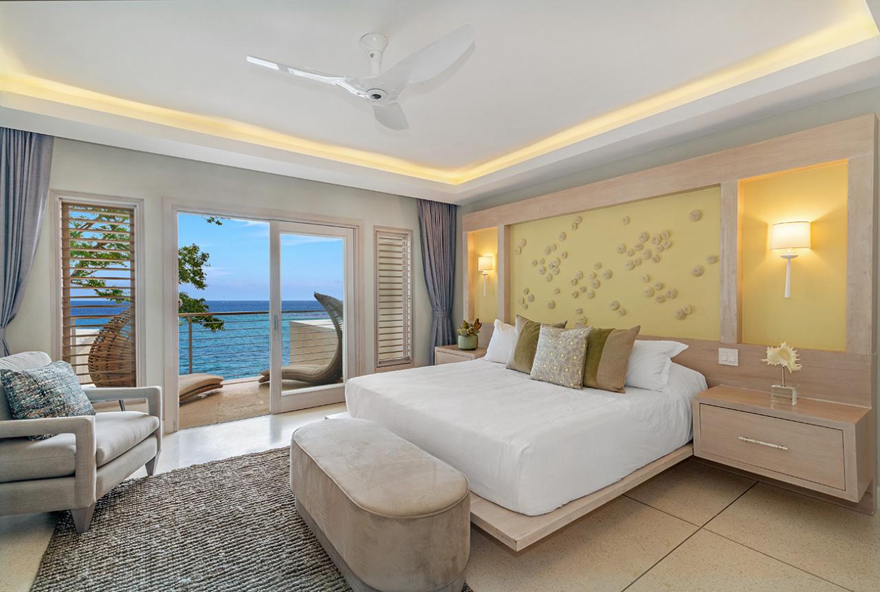 Sea Foam: This bedroom is located on the upper level. It has a king-sized bed, remote control air-conditioning, a ceiling fan, and a flat-screen SMART TV. This room also has an en-suite bathroom equipped with single artisanal vanity, a robe, a personal safe, and a walk-in rain and handheld shower. This suite opens to an ocean-facing balcony.