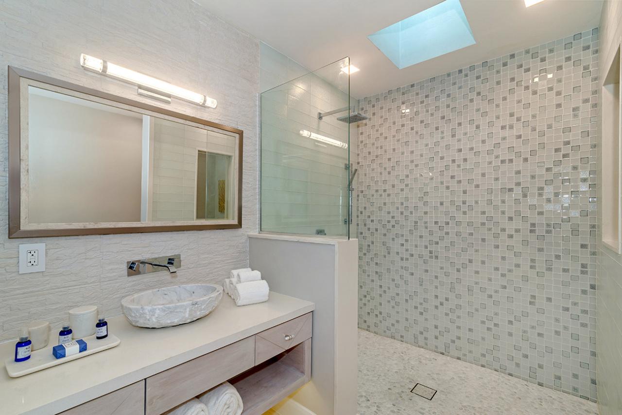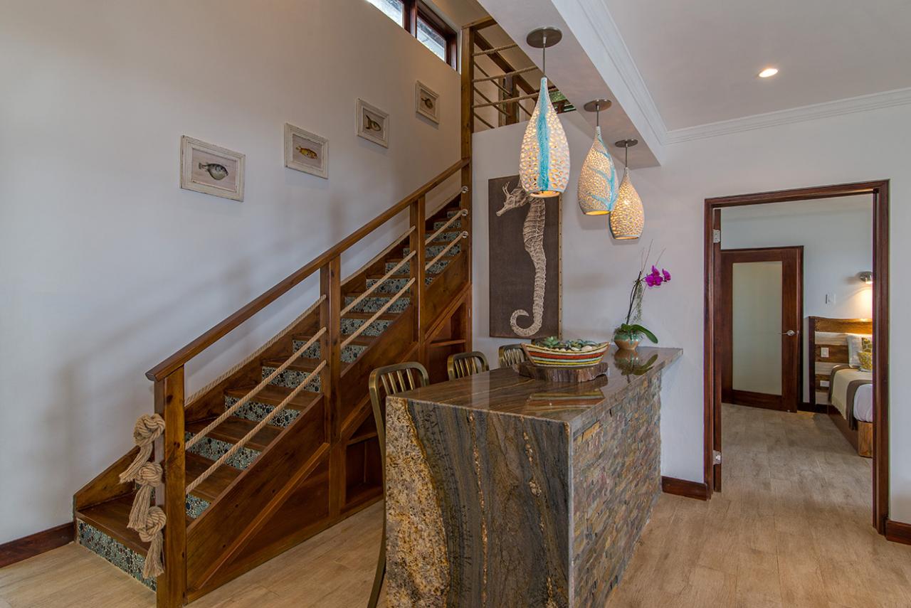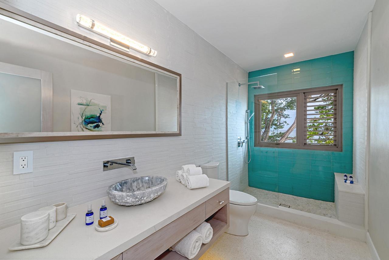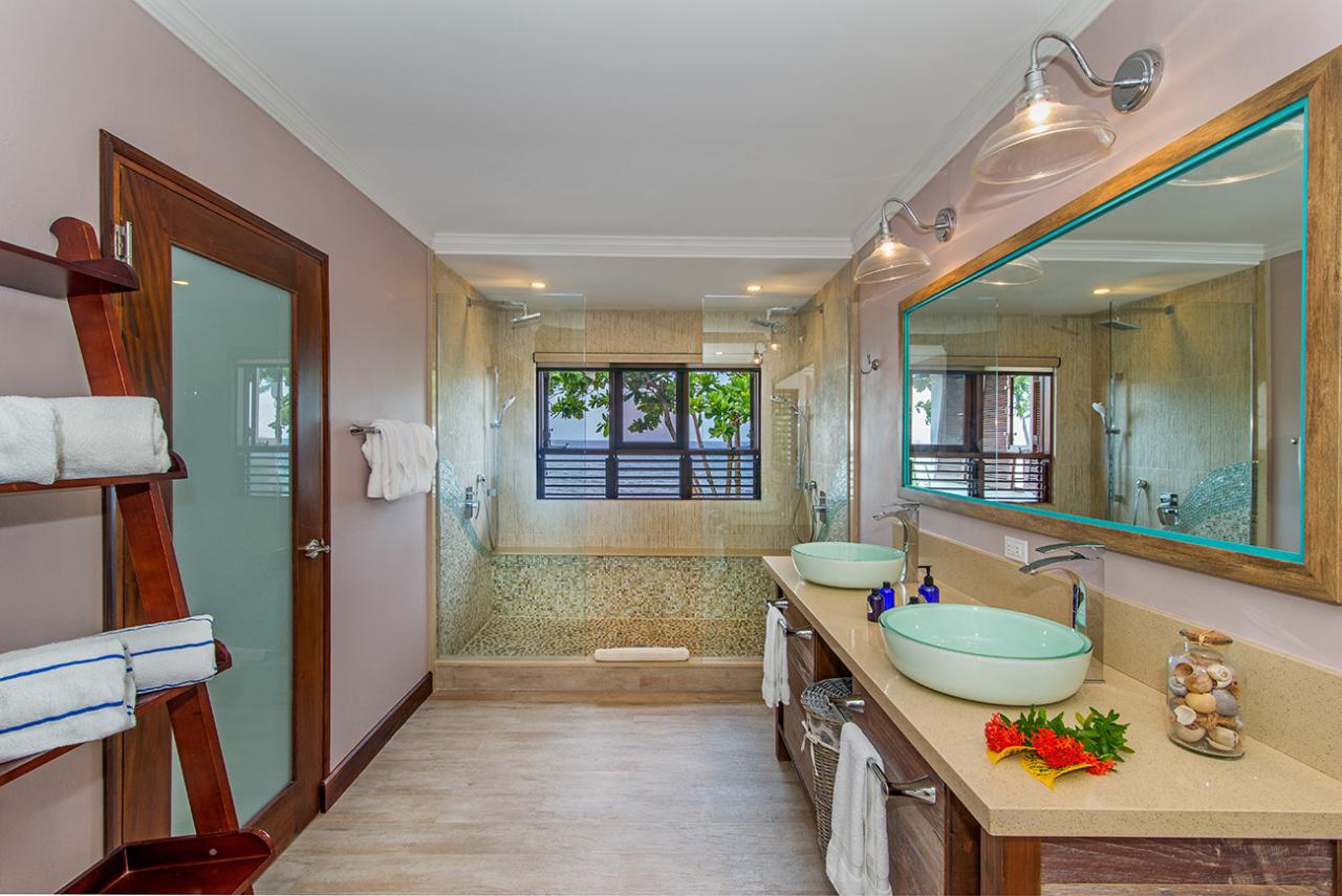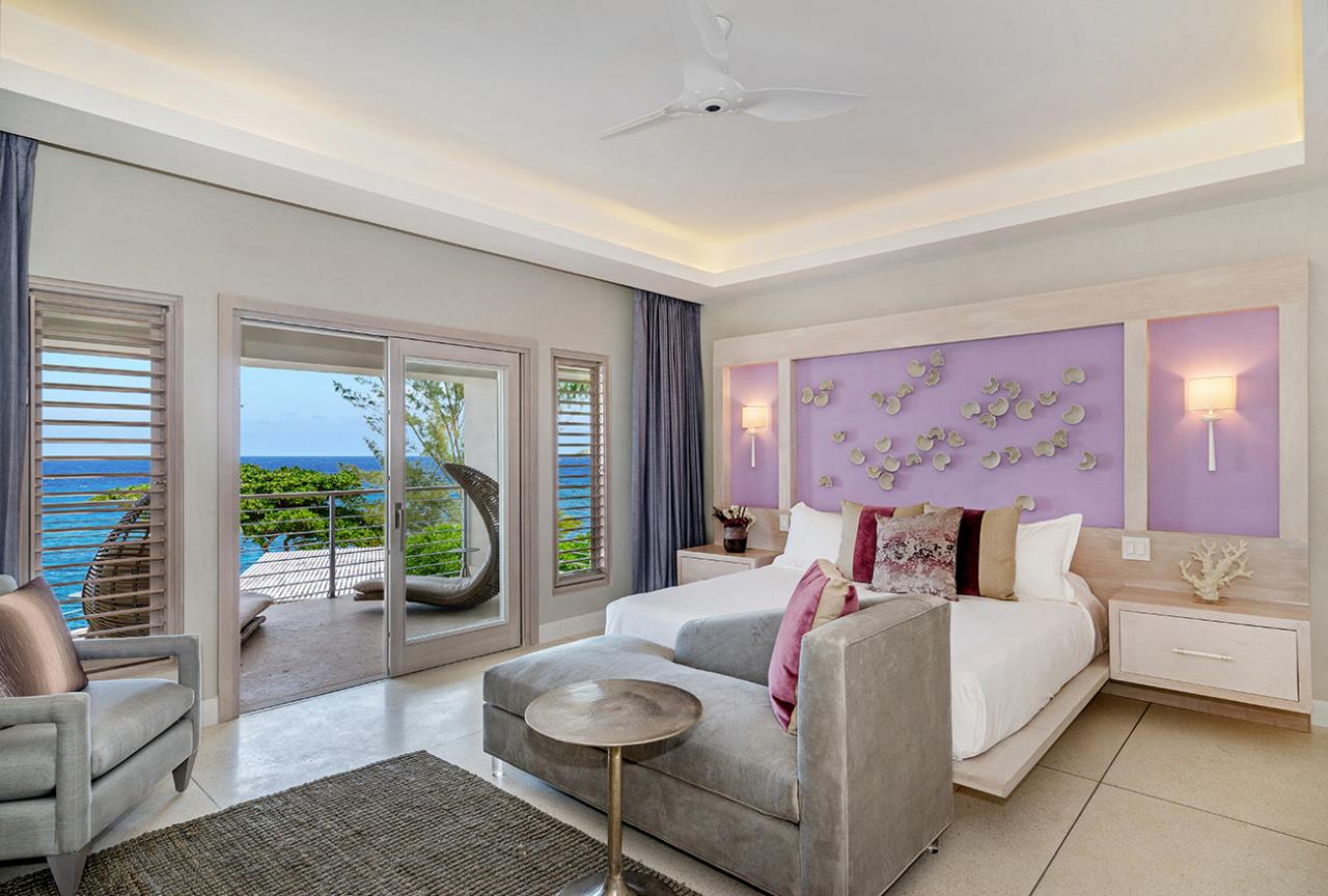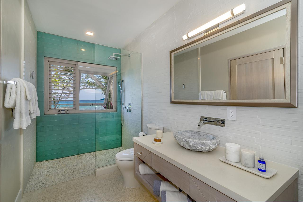 Sea Foam: This bedroom is located on the upper level. It has a king-sized bed, remote control air-conditioning, a ceiling fan, and a flat-screen SMART TV. This room also has an en-suite bathroom equipped with single artisanal vanity, a robe, a personal safe, and a walk-in rain and handheld shower. This suite opens to an ocean-facing balcony.