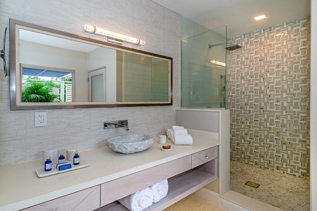 Driftwood: This bedroom is located on the upper level. It has a king-sized bed, remote control air-conditioning, a ceiling fan, and a flat-screen SMART TV. This room also has an en-suite bathroom equipped with single artisanal vanity, a robe, a personal safe, and a walk-in rain and handheld shower. This suite opens to an ocean-facing balcony.
