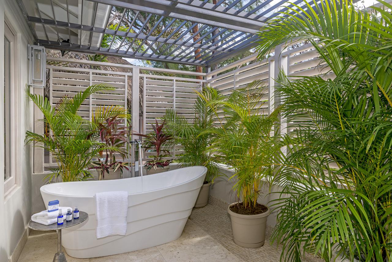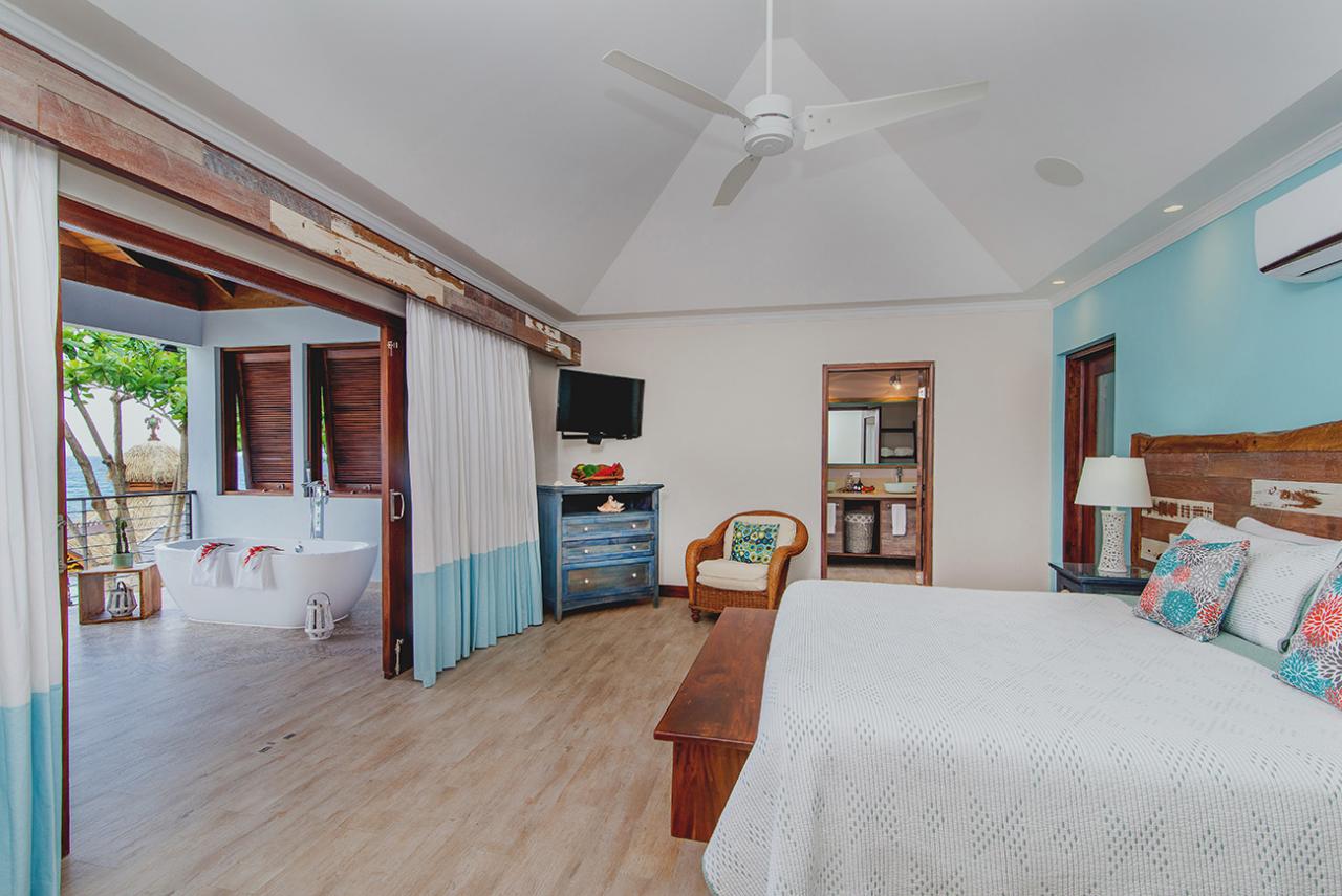 Sea Fan: This bedroom is a master suite located on the upper level. It has a king-sized bed, remote control air-conditioning, a ceiling fan, and a flat-screen SMART TV. This room also has an en-suite bathroom equipped with a walk-in rain shower, a separate walk-in closet, a robe, a personal safe, and a lush open-air garden with a rain shower and deep tub. This suite opens to an ocean-facing balcony with hanging chairs.