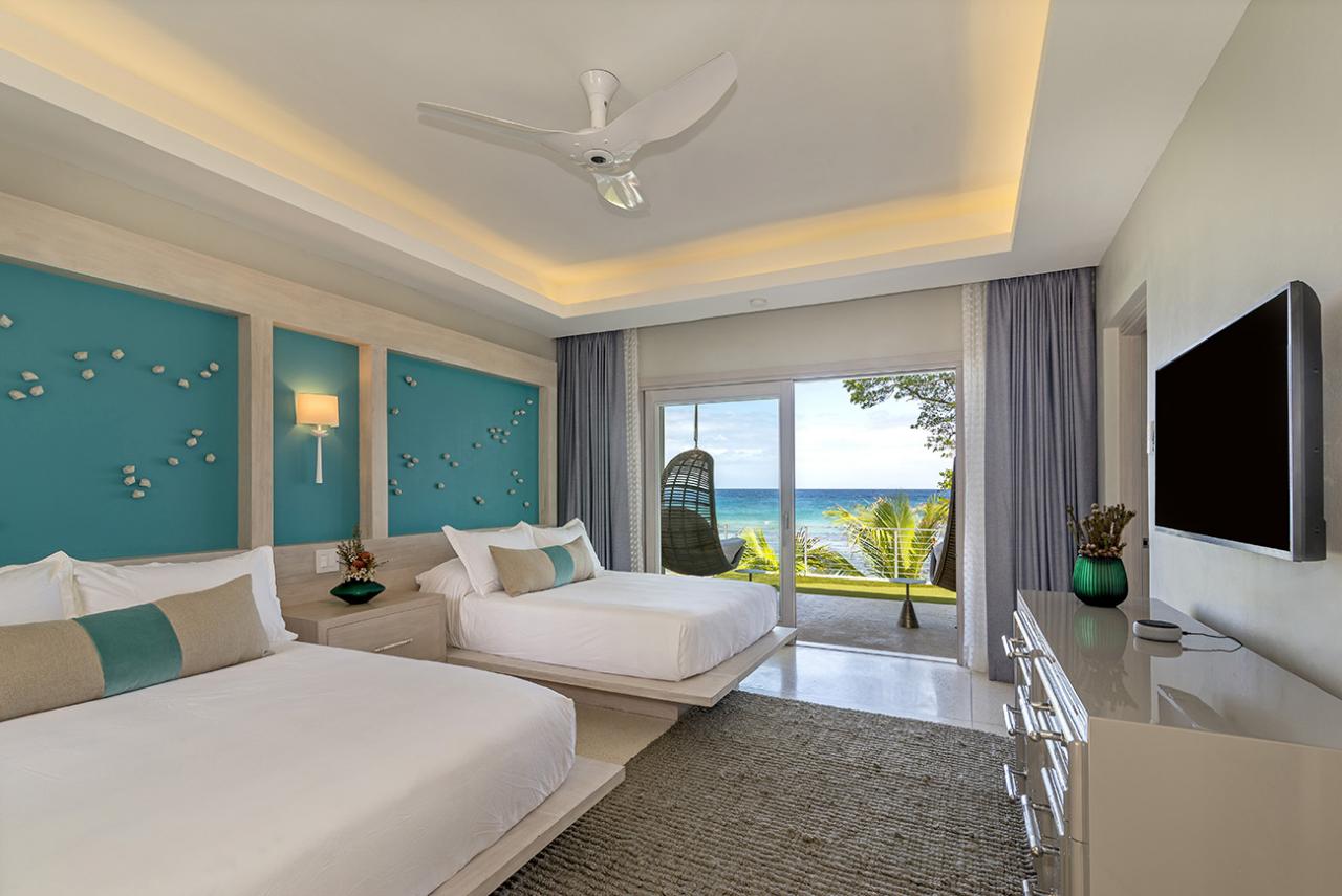 Jellyfish: This bedroom is located on the ground level. It has two full-sized beds, remote control air-conditioning, a ceiling fan, and a flat-screen SMART TV. This room has an en-suite bathroom equipped with single artisanal vanity, a robe, a personal safe, and a walk-in rain and handheld shower. This suite opens to a sea-facing veranda with hanging chairs.
