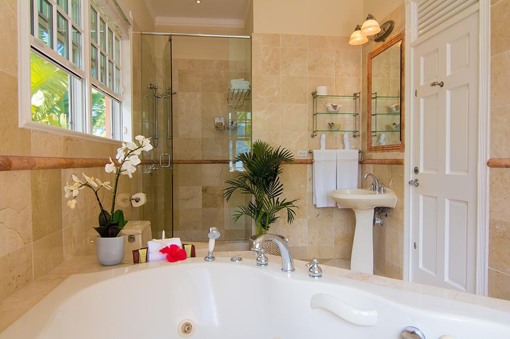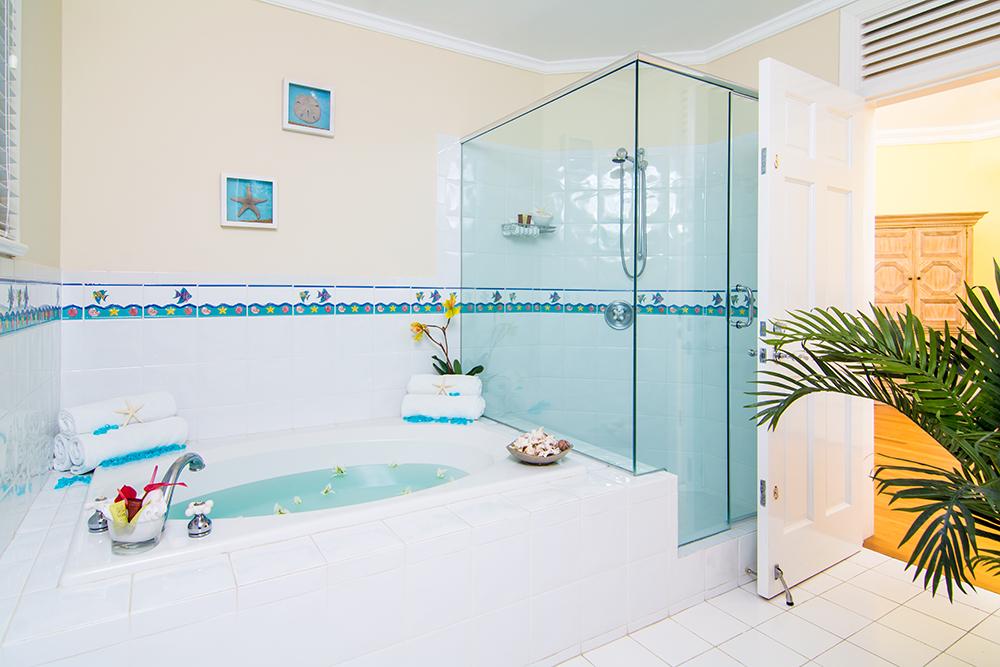 Bedroom 1: Primary with king bed, 32” plasma TV, large en suite bathroom with glass-door walk-in shower and jacuzzi, private balcony, lagoon view, AC