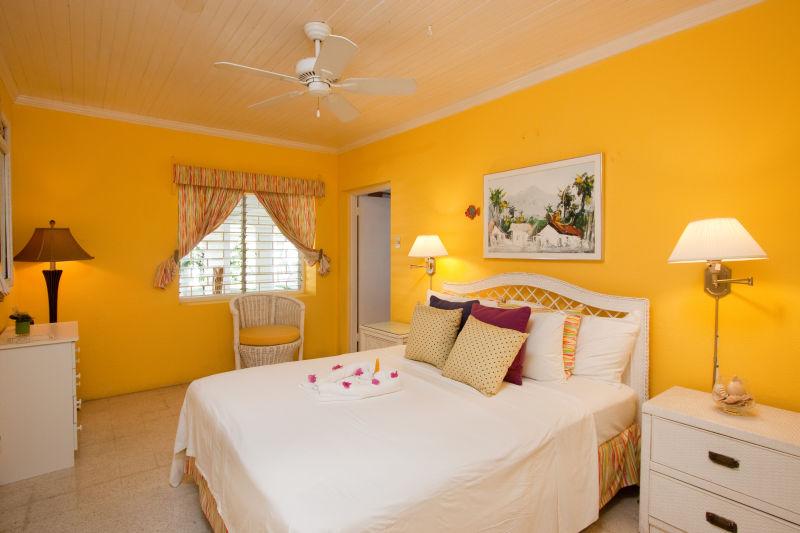 Bedroom 1: King bed (can be converted to two twin beds), AC, en suite bathroom with bathtub and shower, TV, ceiling fan, safe