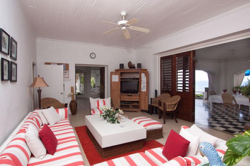 Golden Clouds villa is a luxurious 9 suite estate situated in a park like, 6 acre setting. It is a spectacular oceanfront villa located on Jamaica's fabled North Coast in the picturesque village of Oracabessa. Located a fifteen minute drive from Ocho Rios, the villa overlooks a private palm fringed, white sand beach and the Caribbean Sea. Surrounded by manicured lawns and gardens, the property consists of a main villa with 7 suites and a garden villa with an additional 2 suites and its own kitchen and living area. Each building has a large veranda and its own swimming pool. Golden Clouds is situated between the Golden Eye Resort where Ian Fleming wrote many of the James Bond novels and Noel Coward's "Firefly". The villa consists of 6 landscaped acres of tropical beauty and 700 feet of oceanfront with it's own private white sand beach. From the beach, step into the Caribbean Sea and enjoy the many wonders of snorkeling right in front of the villa or relax on the ocean dock anchored a few feet from the beach. With an 80% return rate for guests, Golden Clouds is recognized as one of the top villas in Jamaica. It is renowned for its excellent service staff, luxurious accommodations, superb and varied kitchen skills, and preserving the simple island beauty in its natural state. This 5 star, private villa is available for your pleasure, retreat, reunion, or getaway. It is perfect for families on holiday, weddings, or reunions, a business workshop or incentive trip, private retreats, or whatever you may need. The relaxing environment and amenities offered can be your home away from home in a tropical paradise.