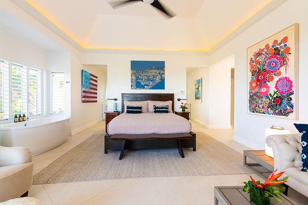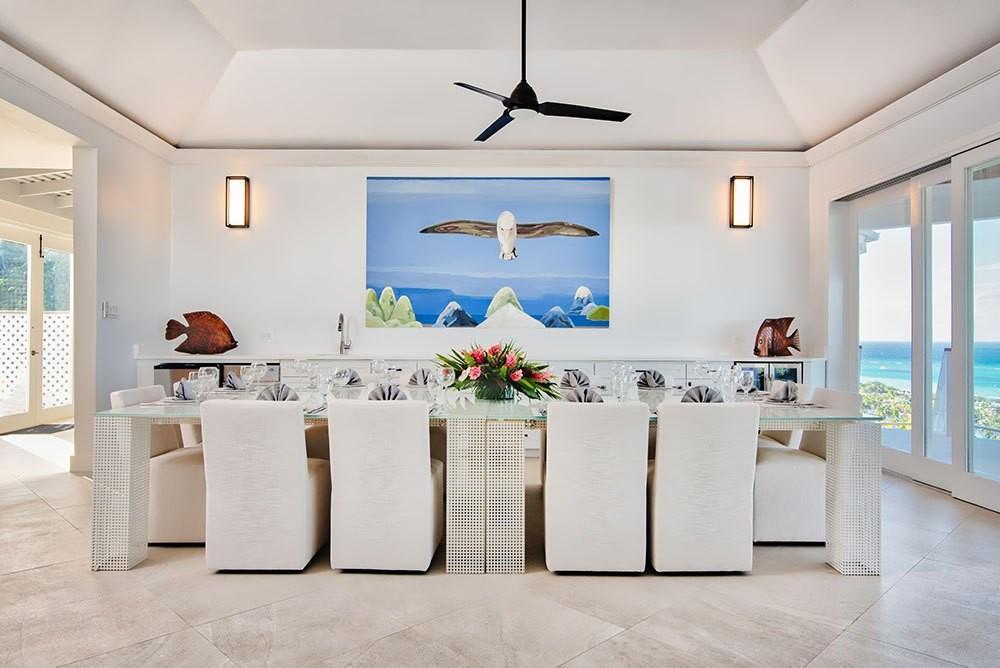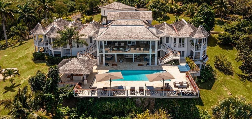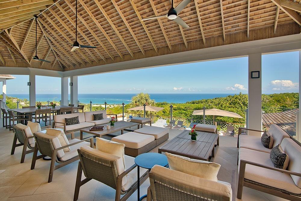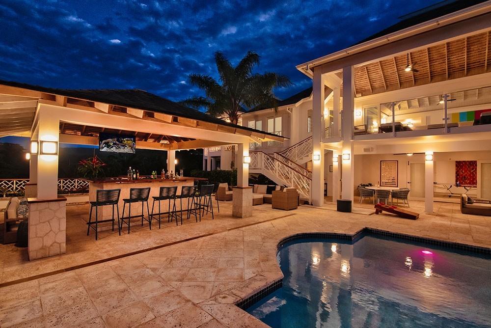Its architecture defines spacious bedroom suites, a long furnished verandah perfect for dining outdoors, a striking red inside dining room and large family play room ~ all enhanced by overviews of the long private pool, acres of landscaped lawns and breathtaking views of the deep blue Caribbean Sea.