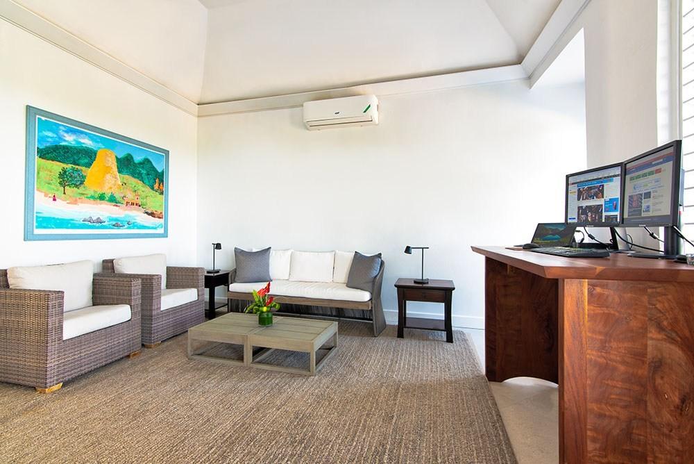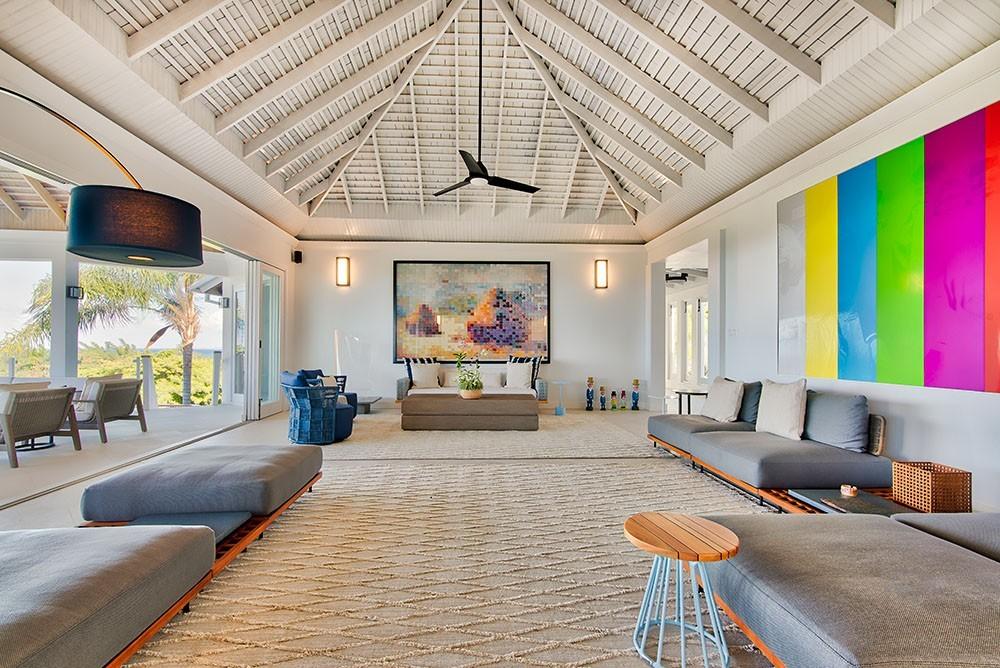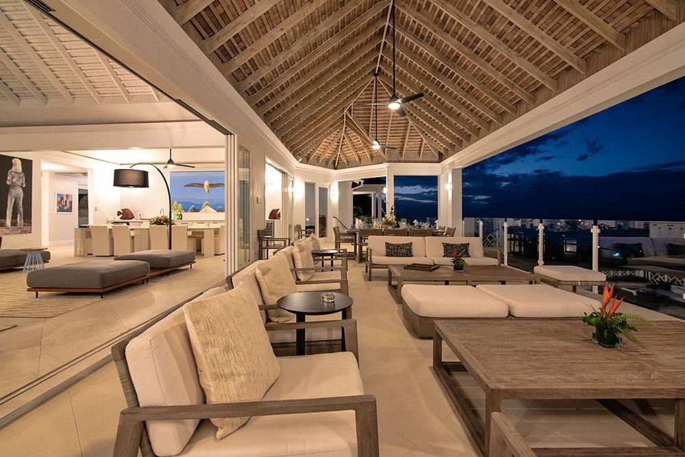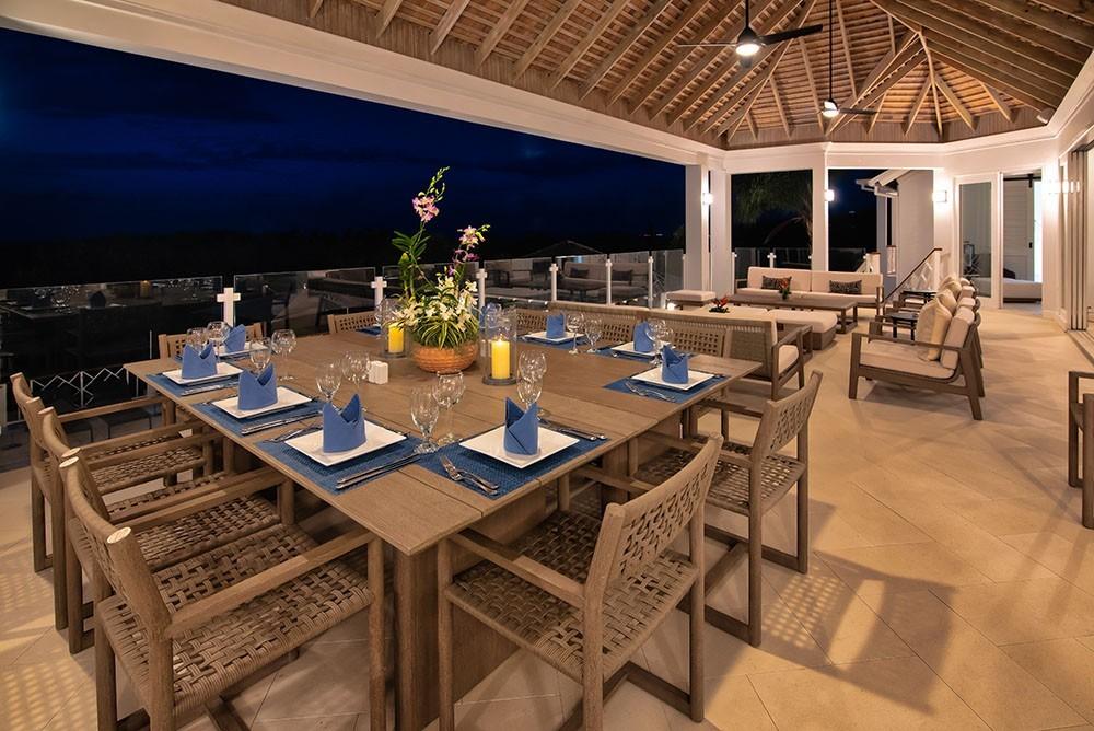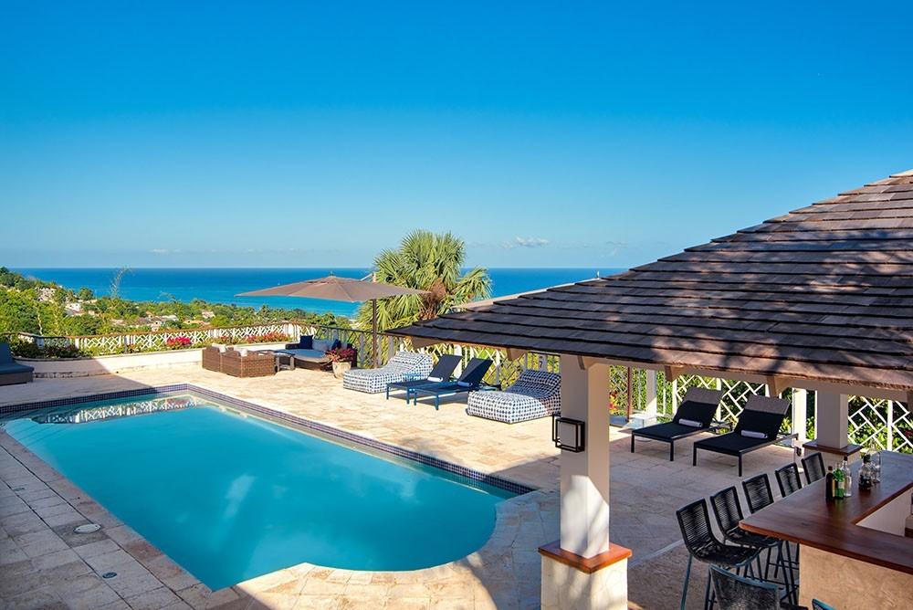 Its architecture defines spacious bedroom suites, a long furnished verandah perfect for dining outdoors, a striking red inside dining room and large family play room ~ all enhanced by overviews of the long private pool, acres of landscaped lawns and breathtaking views of the deep blue Caribbean Sea.