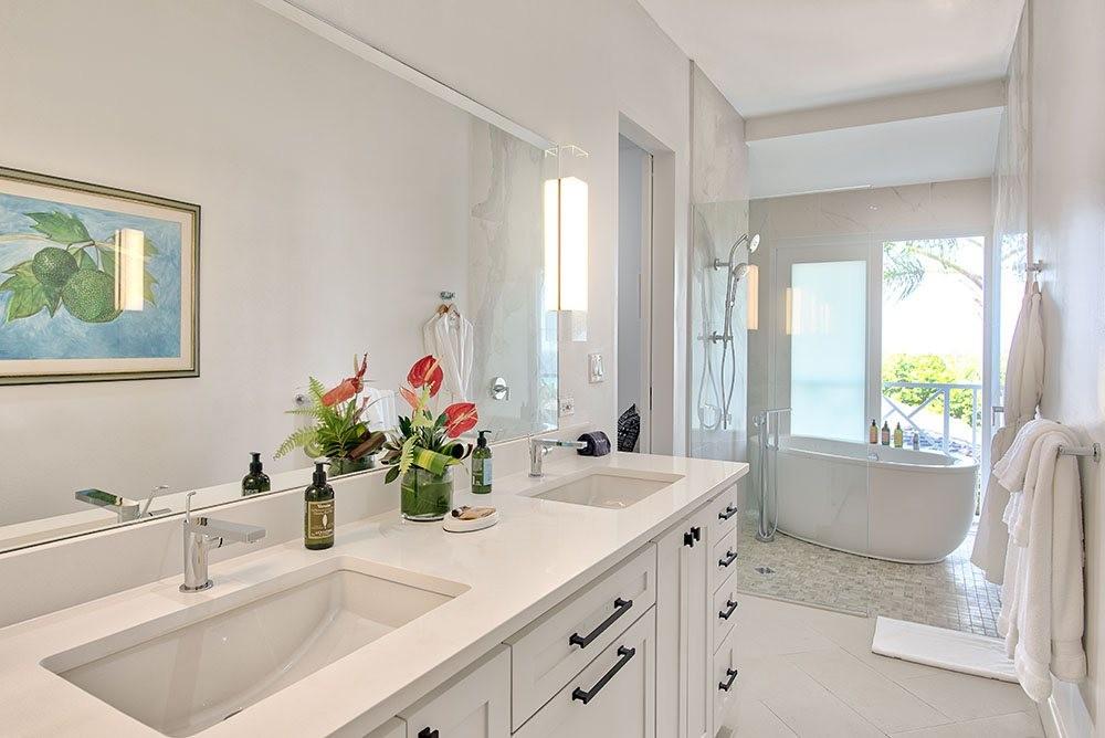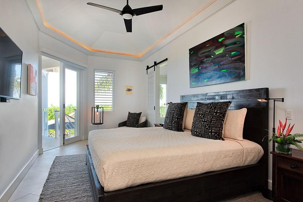 Bedroom 2: Primary with king bed, en suite bathroom with soaking tub, walk-in shower and double-basin vanity, private balcony, sea view, TV