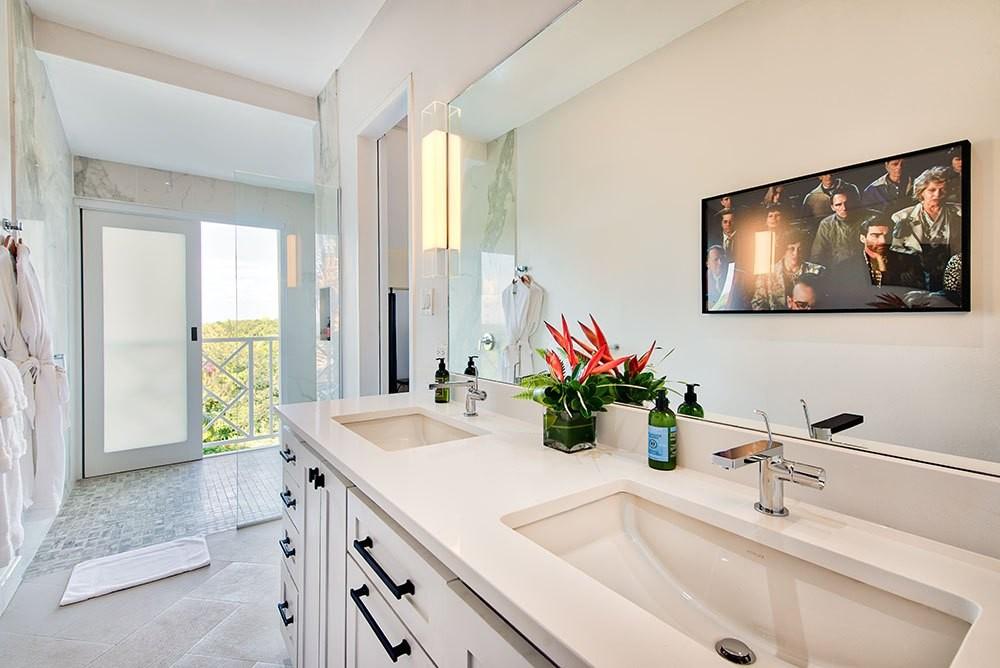 Bedroom 3: Primary with queen bed, en suite bathroom with soaking tub, walk-in shower and double-basin vanity, private balcony, TV, sea view