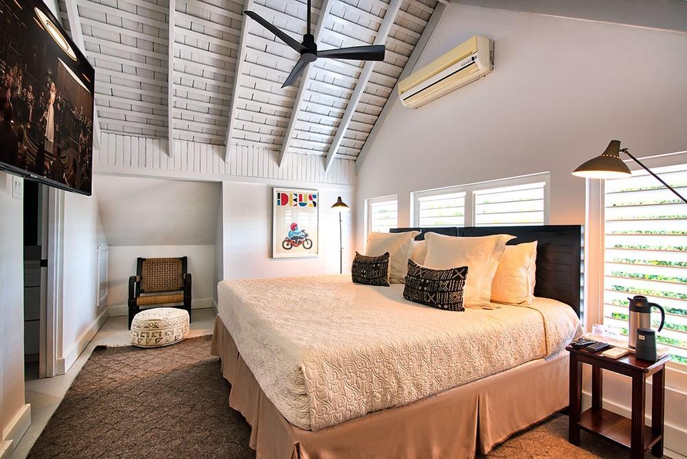 Bedroom 8: King bed (can be converted to two twin beds), shared bathroom with walk-in shower, connected to bedroom 8 by TV room