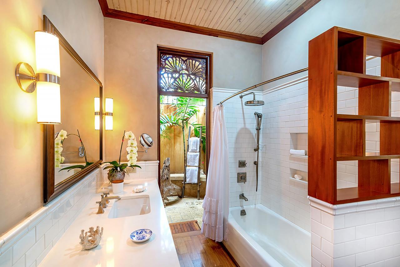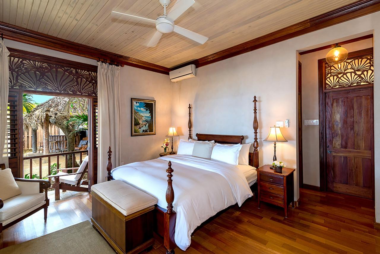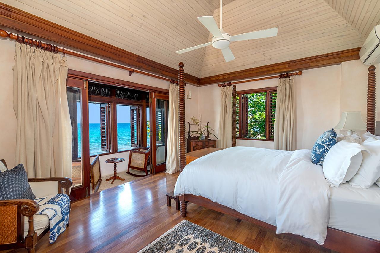Bedroom 6: This room is located in the Cottage. Bedroom 6 is equipped with a king-sized bed, air conditioning, a ceiling fan, an iPod dock, a closet safe, and an ensuite bathroom with a tub-shower combination. This room also opens to the living room, a furnished verandah, a sea view, and a Jacuzzi.