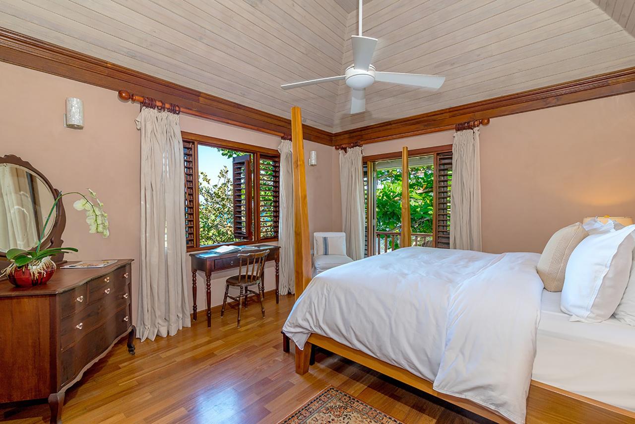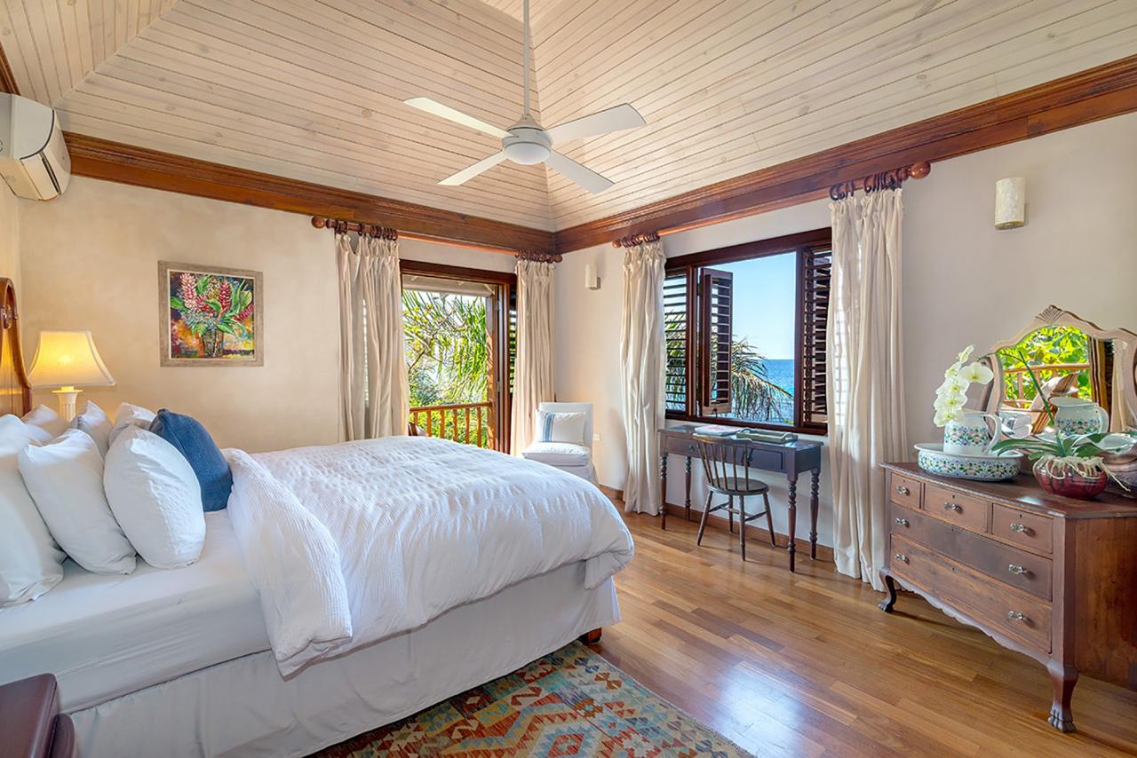 Bedroom 5: This room is located in the Cottage. Bedroom 5 is equipped with a king-sized bed, air conditioning, a ceiling fan, an iPod dock, a closet safe, and an ensuite bathroom with a walk-in shower. This room also opens to the living room, a furnished verandah, a sea view, and a Jacuzzi.