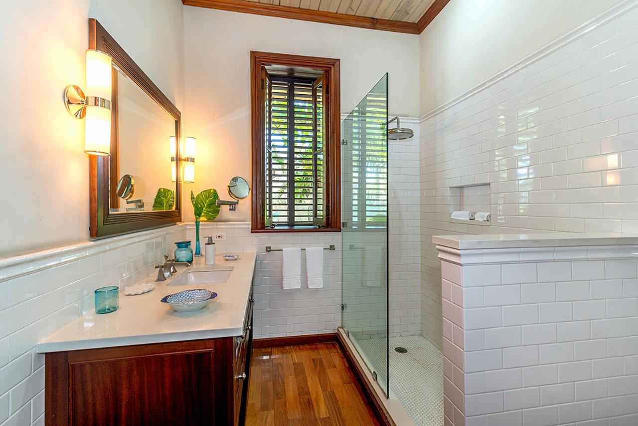 Primary Bedroom: This room is located upstairs. Primary Bedroom is equipped with a king-sized bed, air conditioning, a ceiling fan, an iPod dock, a closet safe, and an ensuite bathroom with a large walk-in shower. This room also features a unique covered porch with rocking chairs and seven louvered windows that can be closed to block light or open to a wonderful sea view.