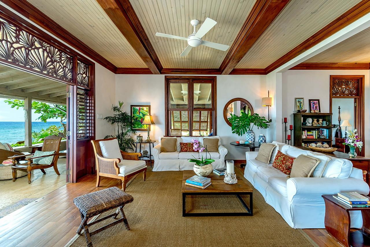 A comfy wrap-around verandah with glorious view is the favorite gathering area. Step off the porch onto a grassy lawn, fresh water pool and terrace, and Travertine stepping stones to the pice de rsistance an open sitting area on a dramatic promontory over the sea with sweeping views from horizon to sunrise to sunset. Sunset vigils with butler-served trays of drinks and hors doeuvres create indelible memories of each days long, breathtaking dusk. Cameras mandatory.