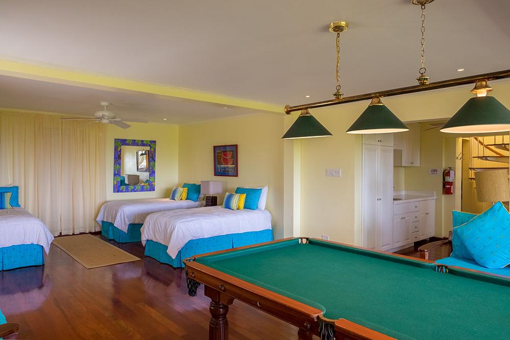 Bedroom 6: This room is located on the main level and is equipped with either three twin-sized or one twin-sized bed plus a king-sized bed. This room is an extremely spacious room with a pool table, a wall-mounted 40" television, a kitchenette, and an ensuite bathroom with a walk-in shower. This room is accessed by an exterior spiral staircase and opens to a private terrace and pool.