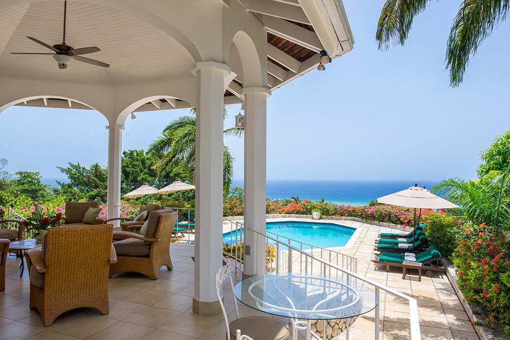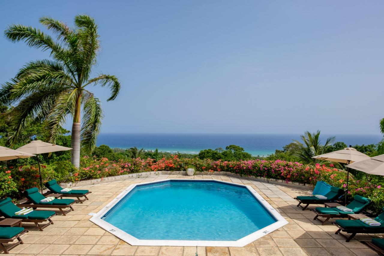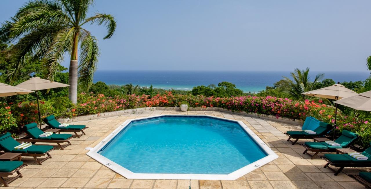 The large octagonal private pool has beautiful teak chaises with plump cushions. A stone terrace wraps around the Caribbean side of the villa. The living room and five bedrooms adjoin this long terrace via French doors that fold back so each doorway opens wide to the vast blue sea view.