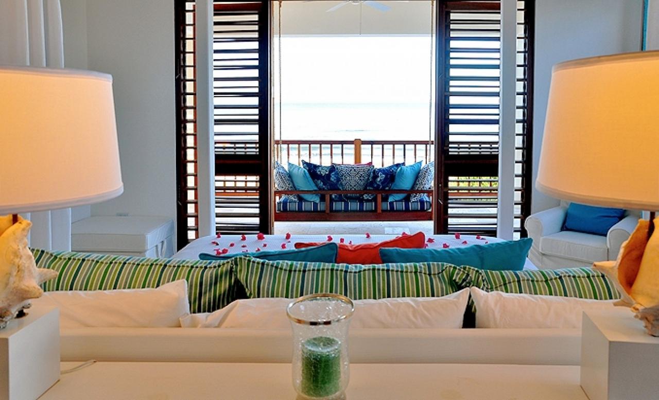 Bedroom 3: King four-poster bed, en suite bathroom with walk-in open-air shower, balcony with swing, ocean view
