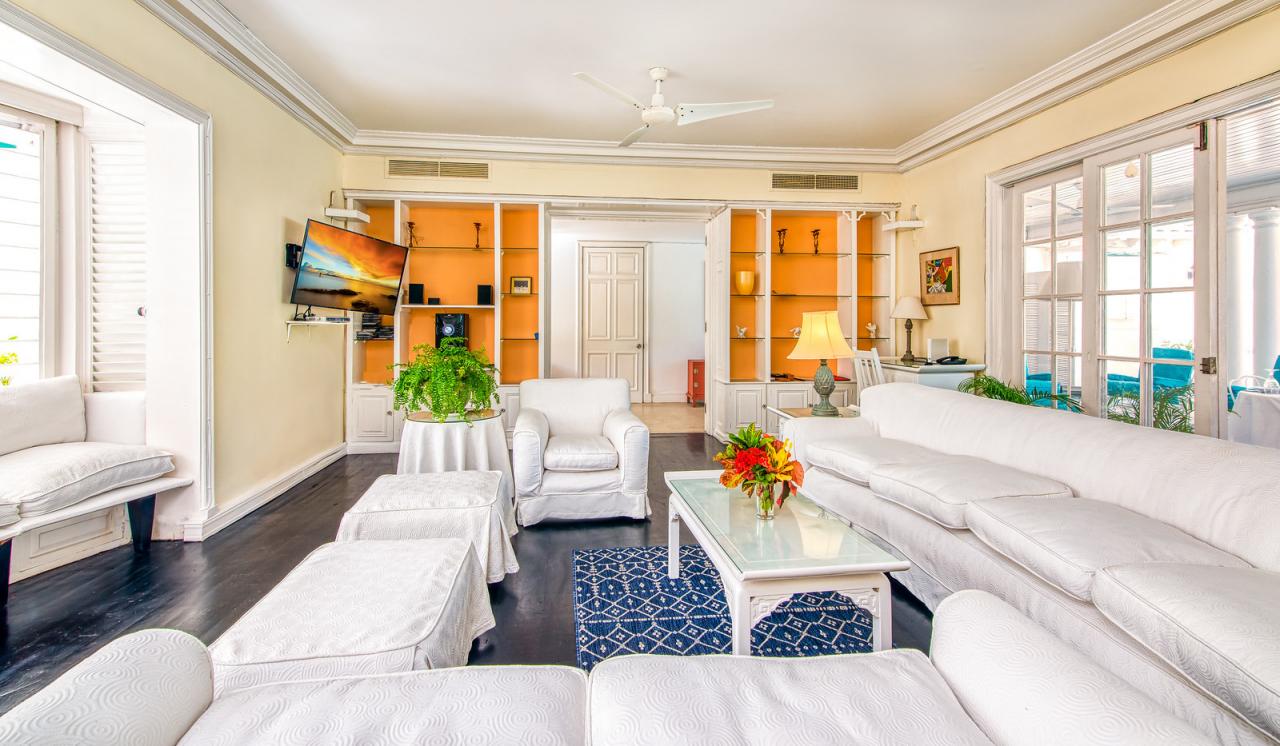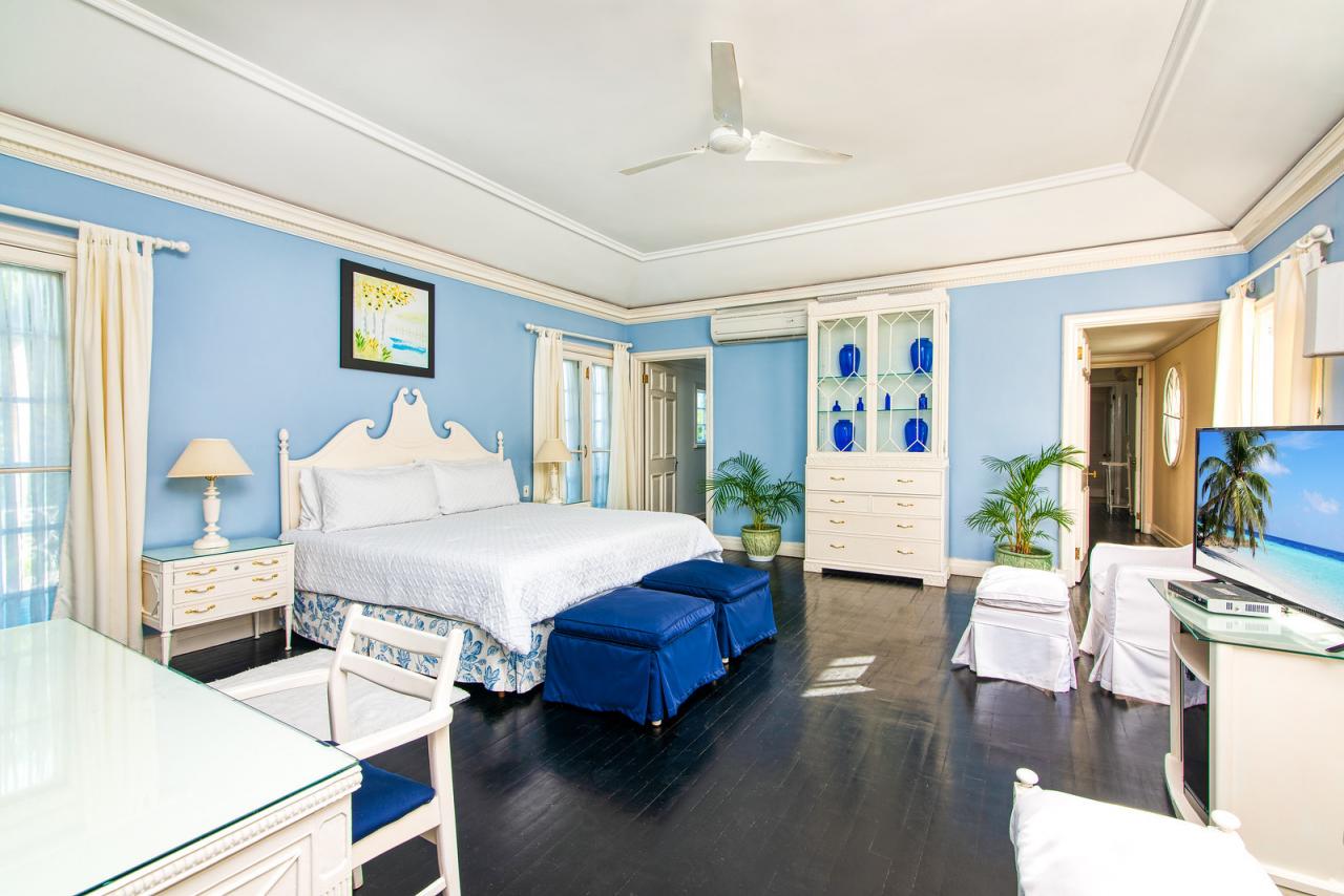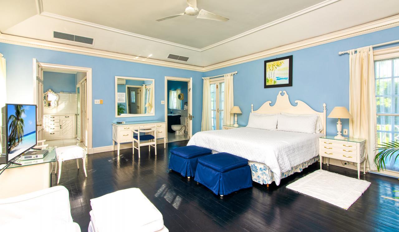 Bedroom 7: This room is located in the East Wing and is equipped with a king-sized bed (or two twin-sized beds upon request), a television, a DVD, a CD player, air conditioning, and an ensuite bathroom with a tub/shower combination. Bedroom 7 also has a connecting door to Bedroom 6 and opens to the pool terrace.