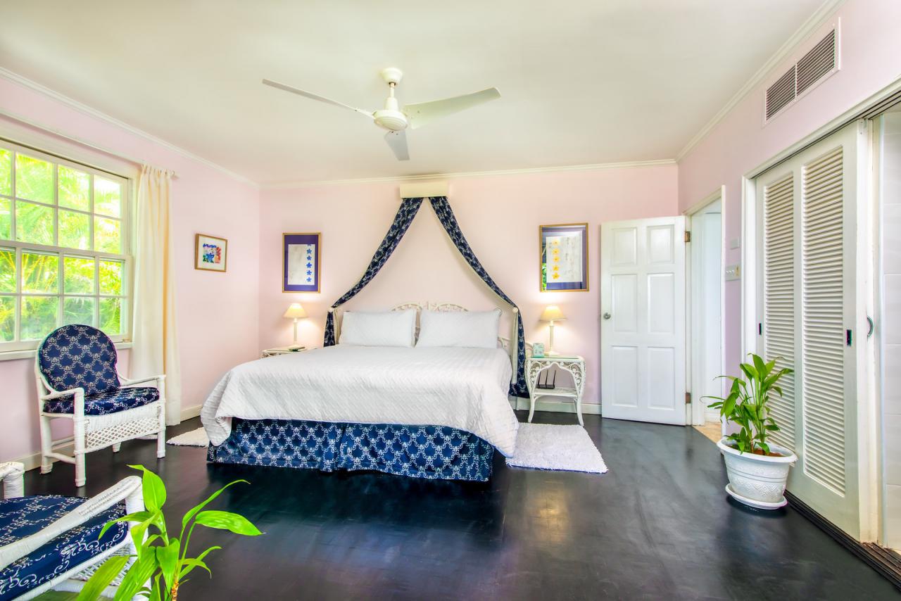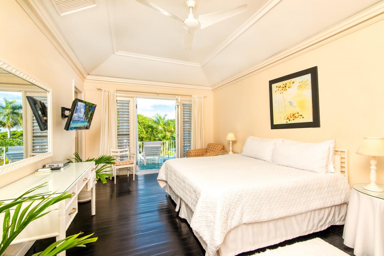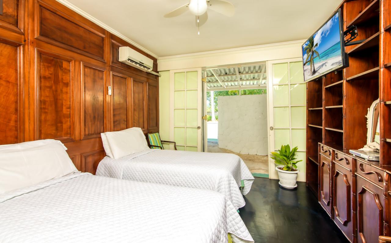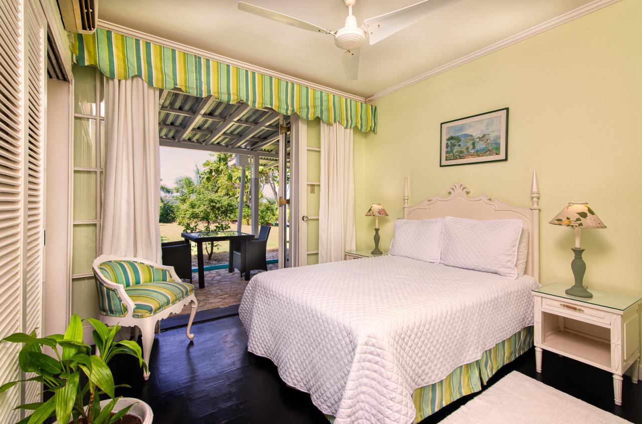 Bedroom 3: This room is located in the West Wing and is equipped with a king-sized bed (or twin-sized beds upon request), a television, a DVD, a CD player, air conditioning, and an ensuite bathroom with a tub/shower combination. Bedroom 3 also opens to the west porch with a hammock and the pool terrace.