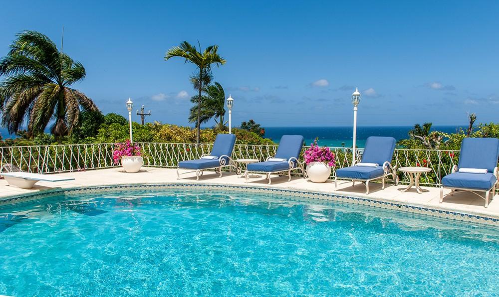 A sweeping spiral staircase leads up to the eponymous round dining gazebo. Adjacent is the long curved balcony overlooking the pool and breathtaking blue view of the Caribbean Sea. White wicker sofas and rocking chairs make this shaded overlook everyones favorite gathering place. With six rocking chairs, chaise and sofa, this lofty piece of paradise is a place of memories formed here through breezy days and relaxed cocktail hours, treasured for their mesmerizing panorama of deep blue sea and uninterrupted horizon.