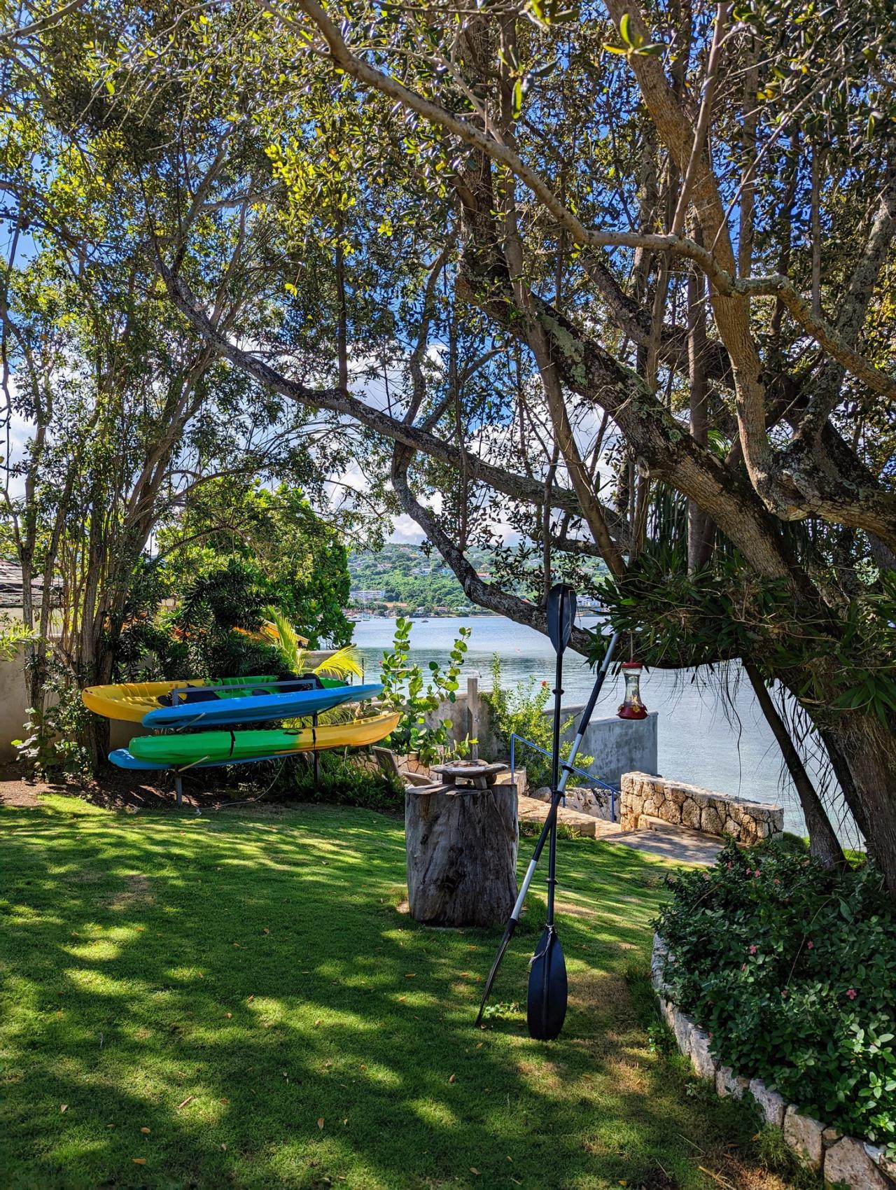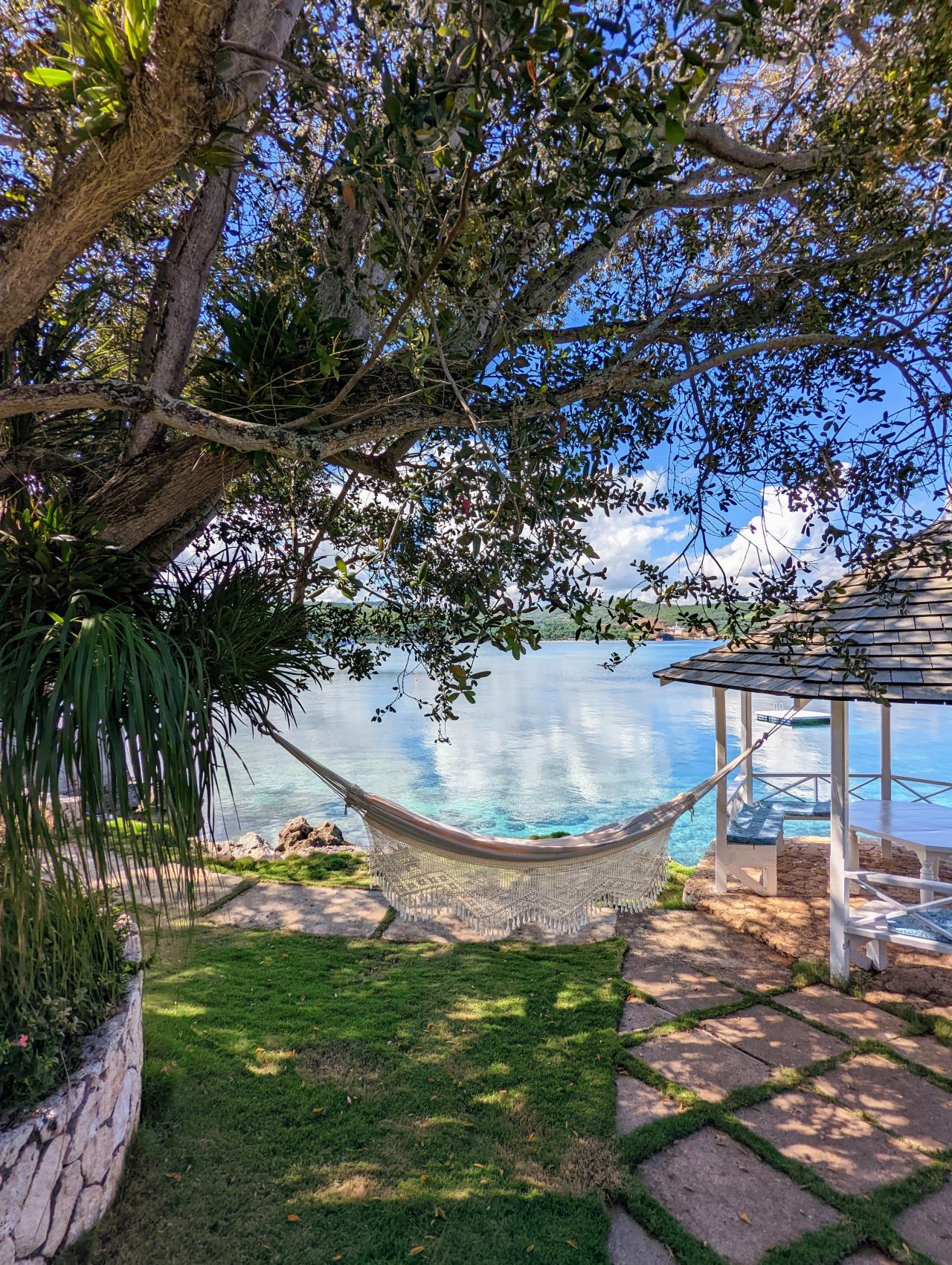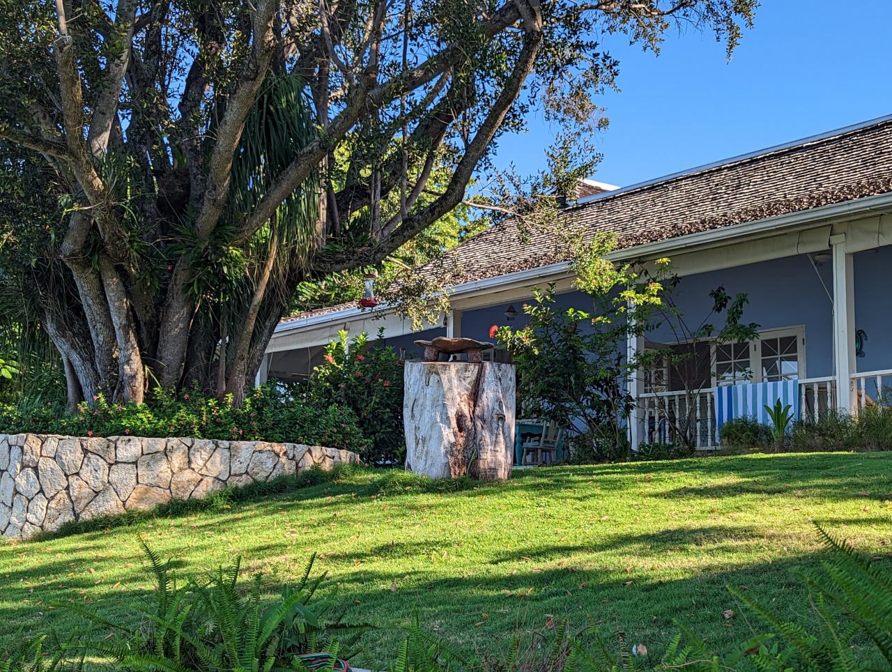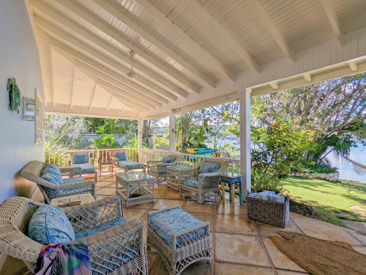 The living room opens wide to the 60' verandah ... furnished in wicker chaises, draped with flowering vines and overlooking the turquoise bay. On one side of the waterfront is a small sandy area. On the other side, cut-stone steps lead into wonderful swimming and snorkeling water. From the water's edge, it's an easy swim to the sunning platform. Watch romantic sunsets from the verandah or Jacuzzi plunge pool.After sunset, your chef will serve you delicious candlelight dinners on Spode china ~ inside, on the open-air verandah, or in the gazebo over a natural coral formation on the water's edge. During the day, a bird feeding tree dapples the gazebo and, in the afternoon, the pool. For all-day sunshine and blue, blue water... luxuriate in the buoyant bay which is Sea Haven's front yard.