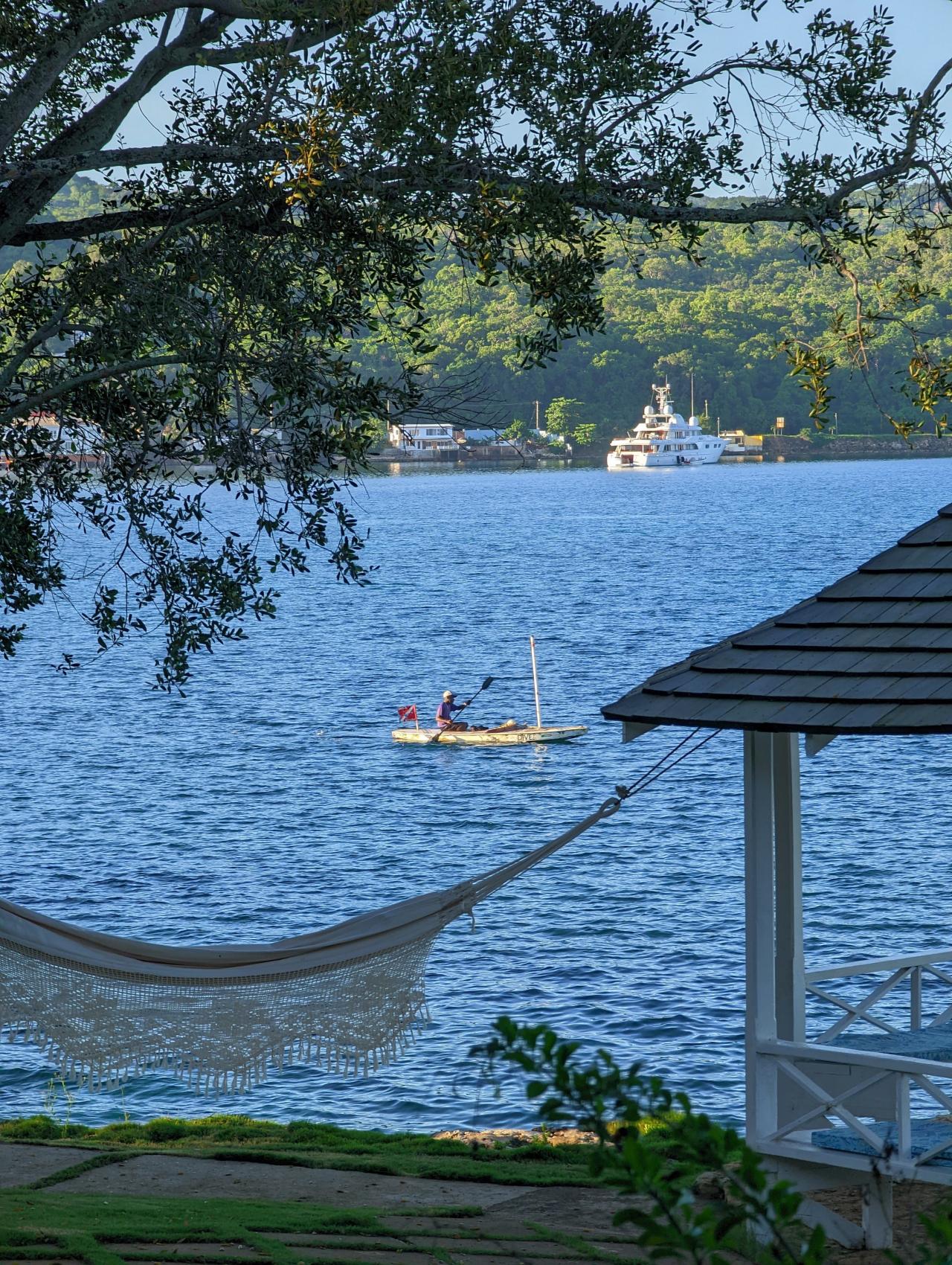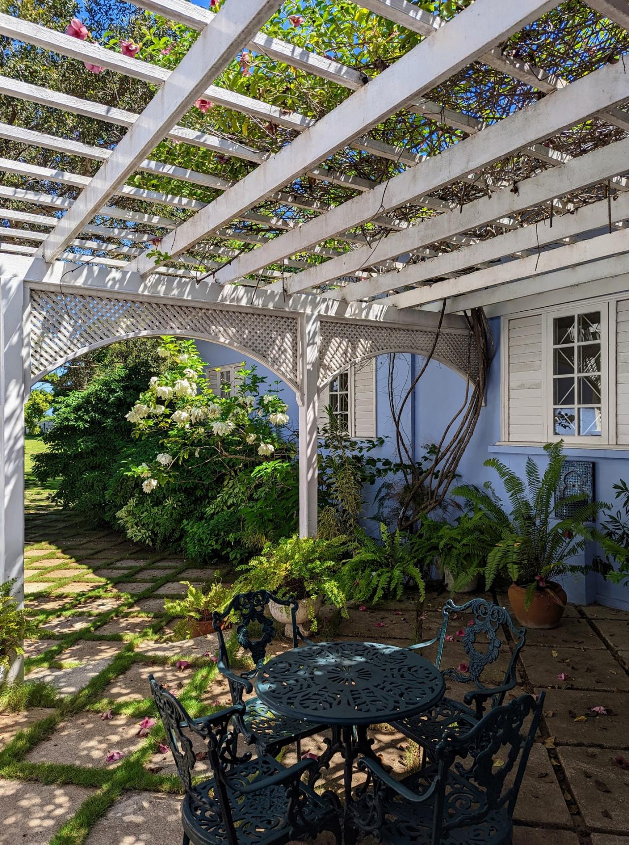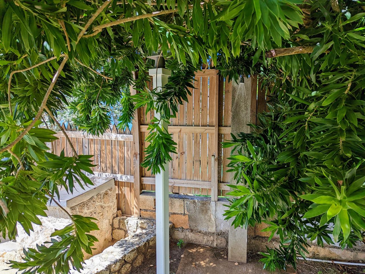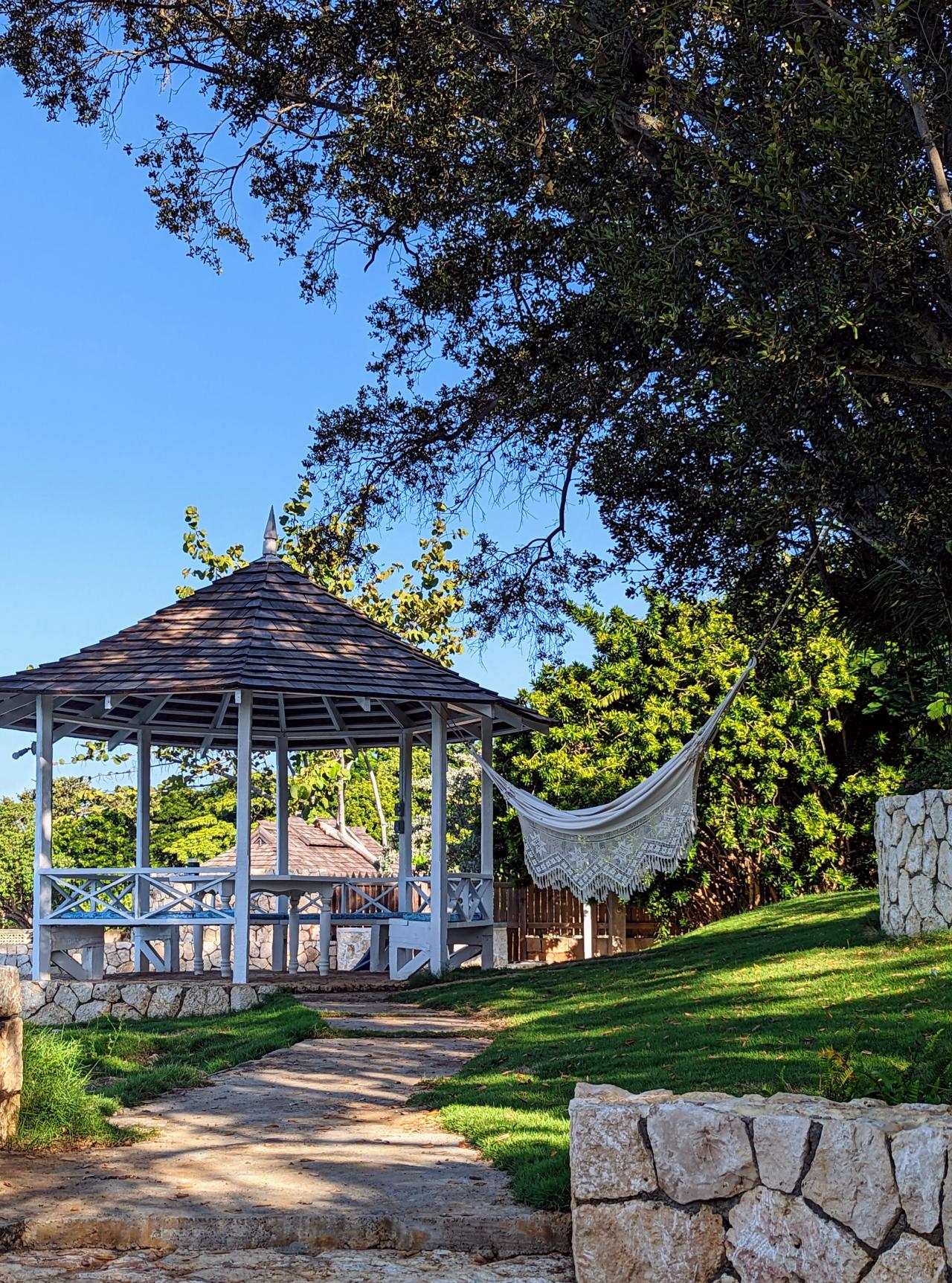 The living room opens wide to the 60' verandah ... furnished in wicker chaises, draped with flowering vines and overlooking the turquoise bay. On one side of the waterfront is a small sandy area. On the other side, cut-stone steps lead into wonderful swimming and snorkeling water. From the water's edge, it's an easy swim to the sunning platform. Watch romantic sunsets from the verandah or Jacuzzi plunge pool.After sunset, your chef will serve you delicious candlelight dinners on Spode china ~ inside, on the open-air verandah, or in the gazebo over a natural coral formation on the water's edge. During the day, a bird feeding tree dapples the gazebo and, in the afternoon, the pool. For all-day sunshine and blue, blue water... luxuriate in the buoyant bay which is Sea Haven's front yard.