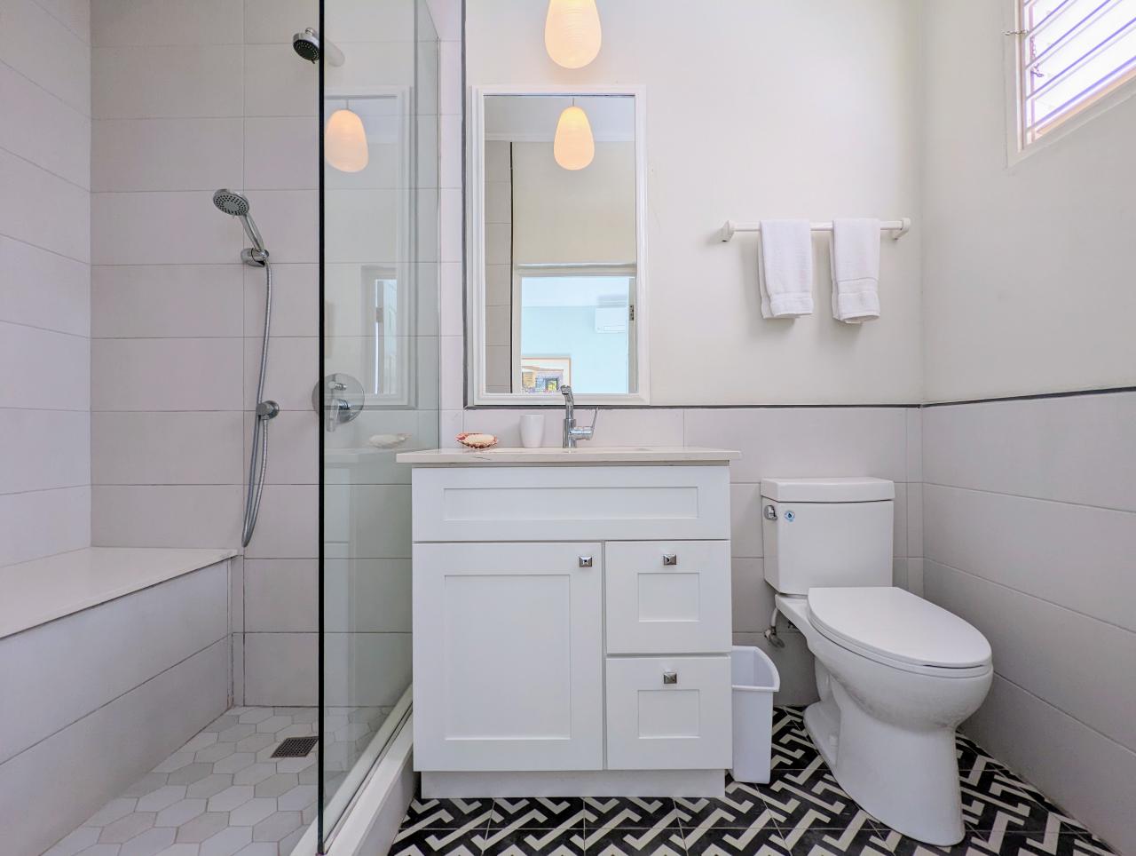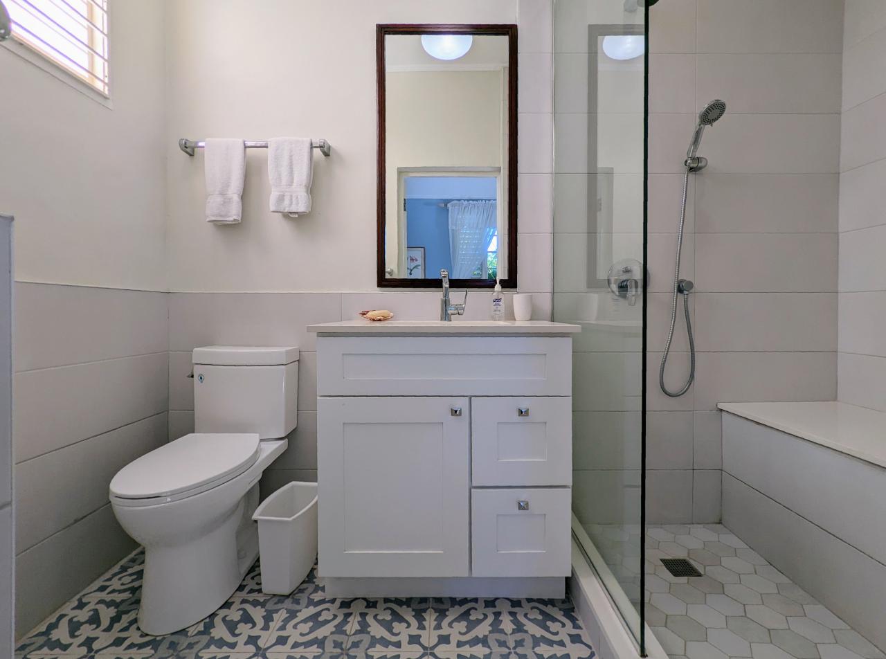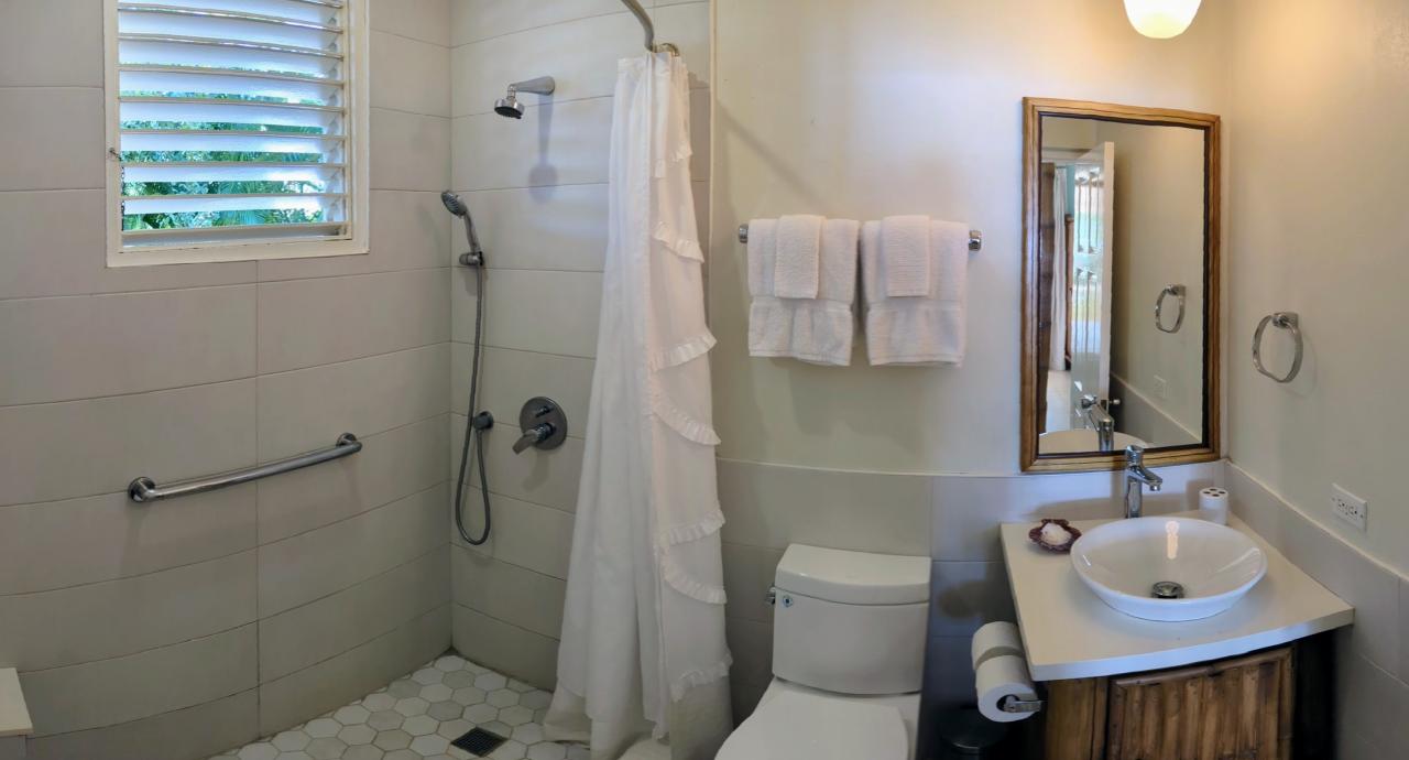 Bedroom 4: This room is equipped with a king-sized bed (or twin-sized beds at guests' options) and an ensuite bathroom with a tiled shower.