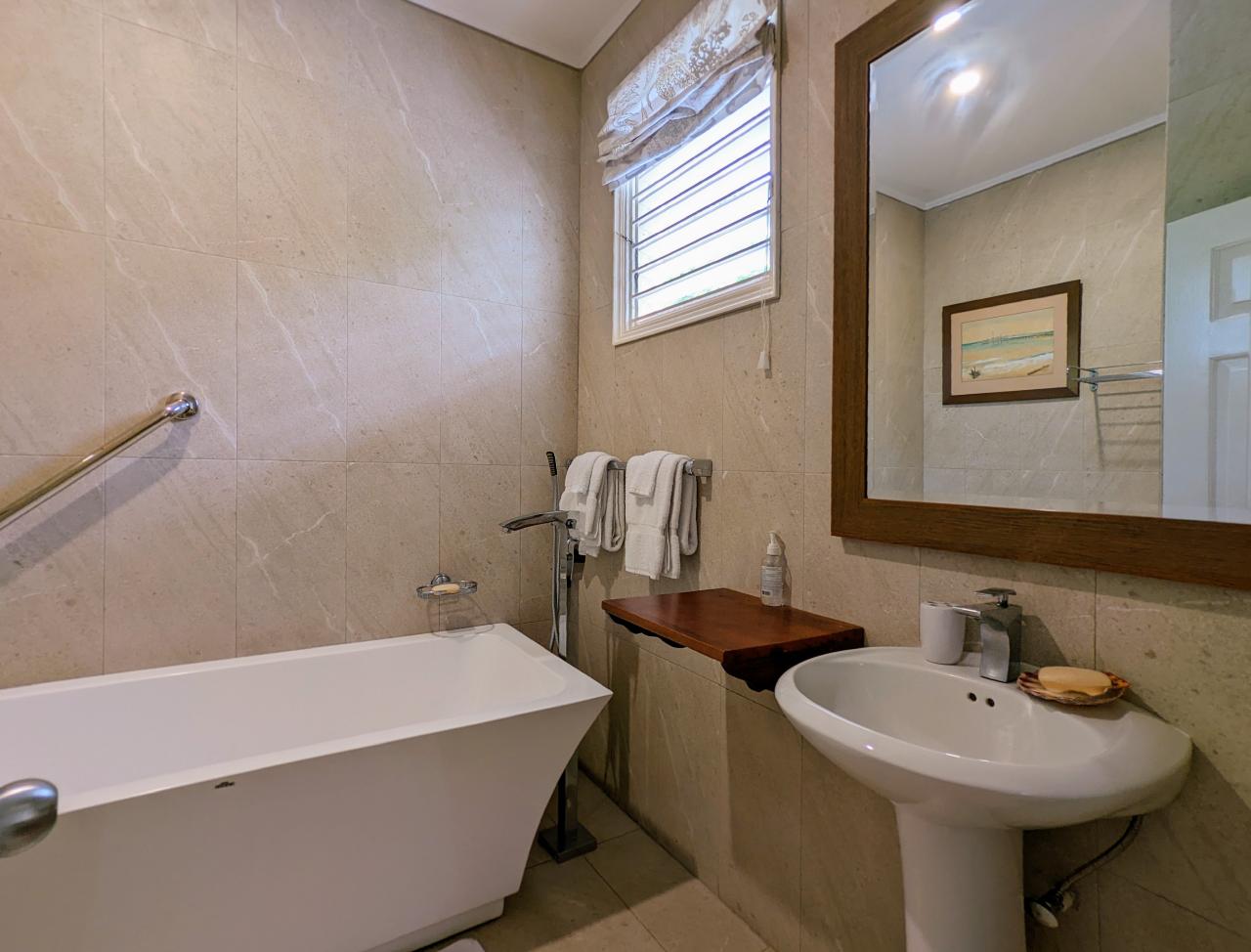Bedroom 2: This room is equipped with a king-sized bed, a view of the Bay and a walk-through window to the verandah, and an ensuite bathroom with a tub-shower combination.