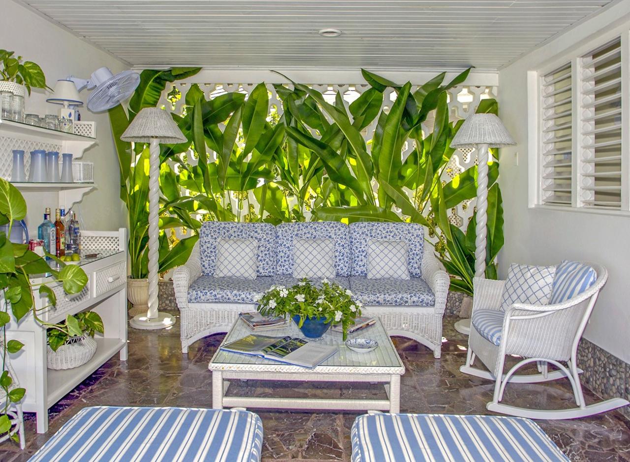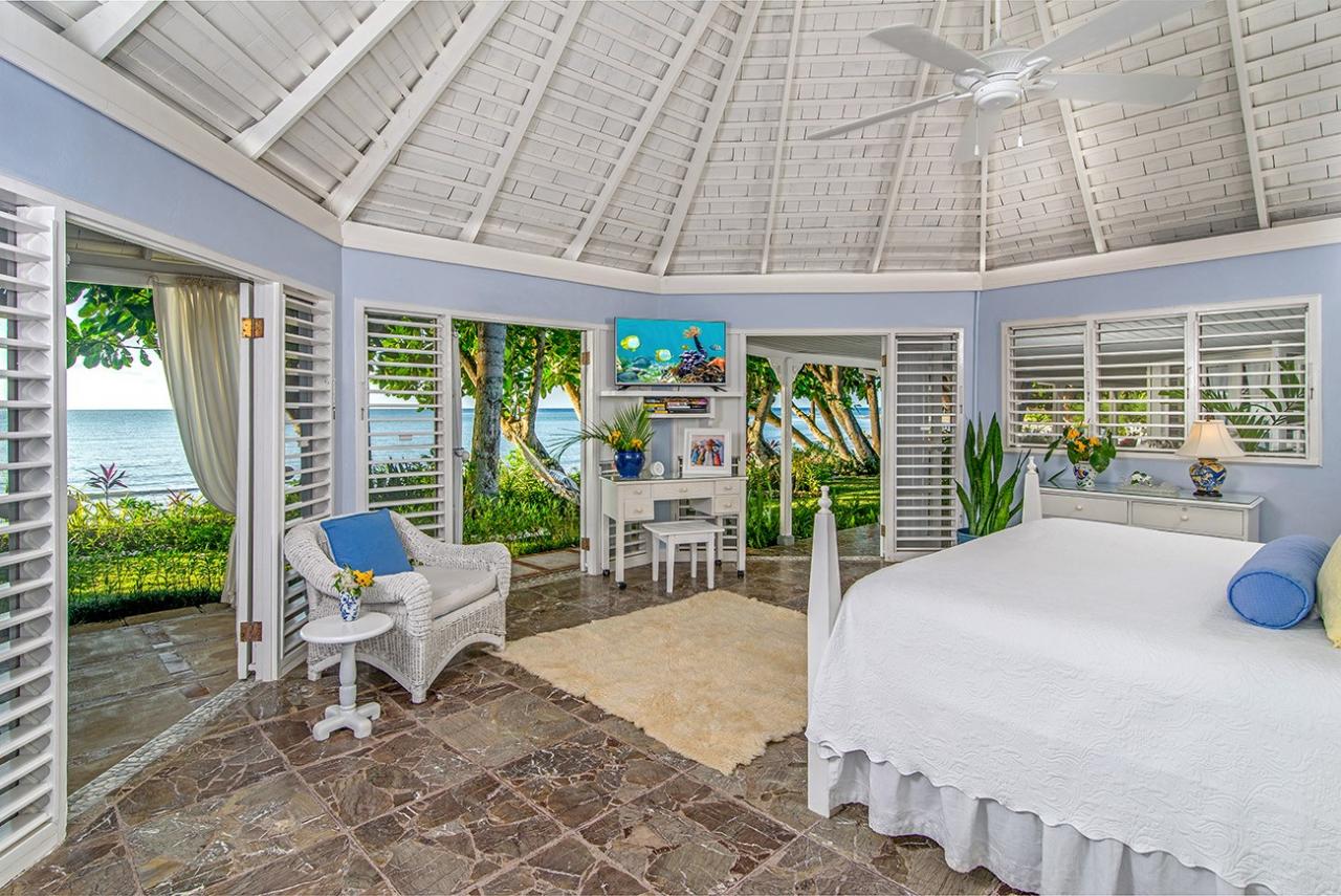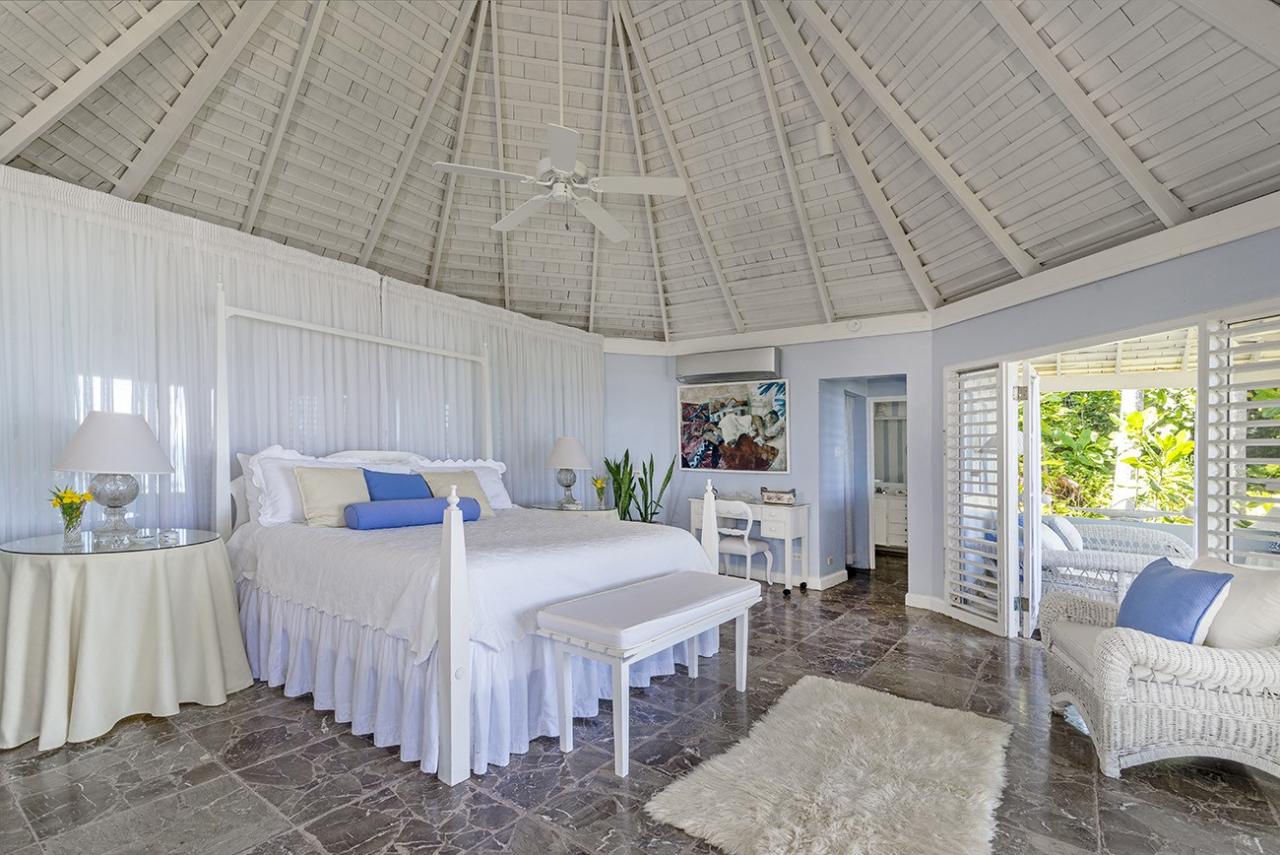 In Caribbean-style architecture, spaces are defined by airy octagonal gazebos and high cedar ceilings. Pretty blue and white fabrics and cool marble floors are throughout. Each bedroom opens to a sitting area for private afternoon naps or all-day gazing at the changing light on the Caribbean Sea ~ practically at your doorstep.