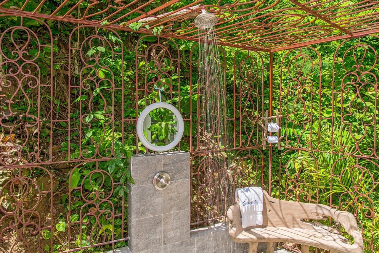 Just beyond the verandah and pool, a terraced walkway leads to the second of 2 outdoor showers, lower waterfront terrace, beach and sea. On calm evenings, you may see our local fishermen laying their nets by torchlight. If the night produces a good catch, they'll return early in the morning with fresh fish or lobster to sell to the Serenity cook for tonights dinner.