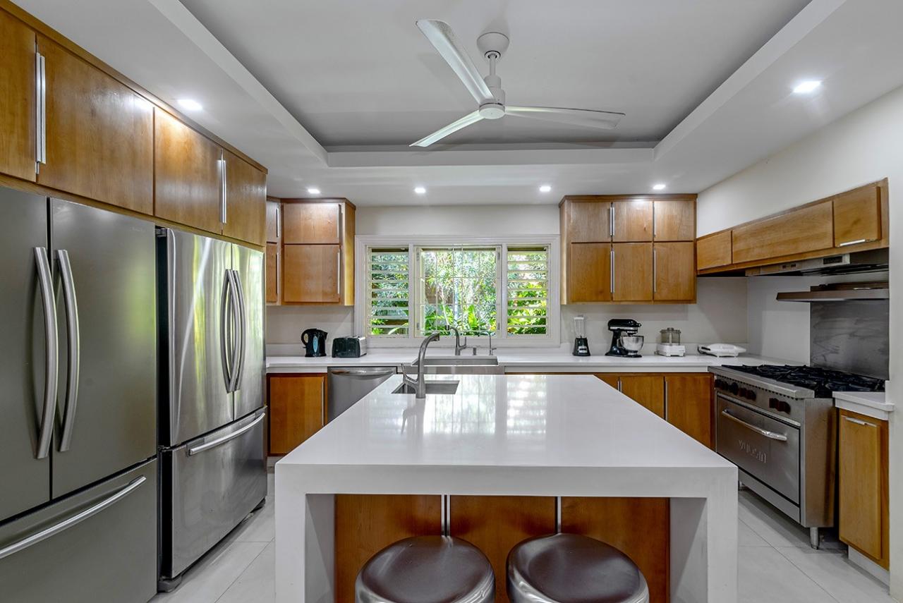 On its own sugary white sand beach lapped by the turquoise waters of Discovery Bay sits the exquisite home Sugar Bay. Interiors are distinguished by elegant custom-designed furniture, color-washed walls, gleaming breadnut floors, and fascinating objets d`art from around the world.