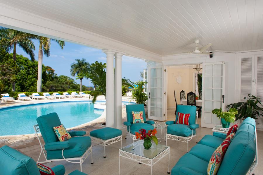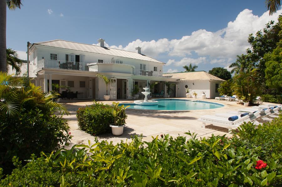 Interiors of this spacious Colonial manor have been refreshed with Laura Ashley fabrics, pretty pastel wall colors, and renovation of the kitchen and all bathrooms. The large living room opens to the covered dining terrace, casual sitting area and wet bar. Just beyond are the spacious open terrace and pool. Four bedrooms and the study (which can accommodate one or two extra guests) are on the main level. A mahogany staircase leads upstairs to two more spacious bedrooms.
