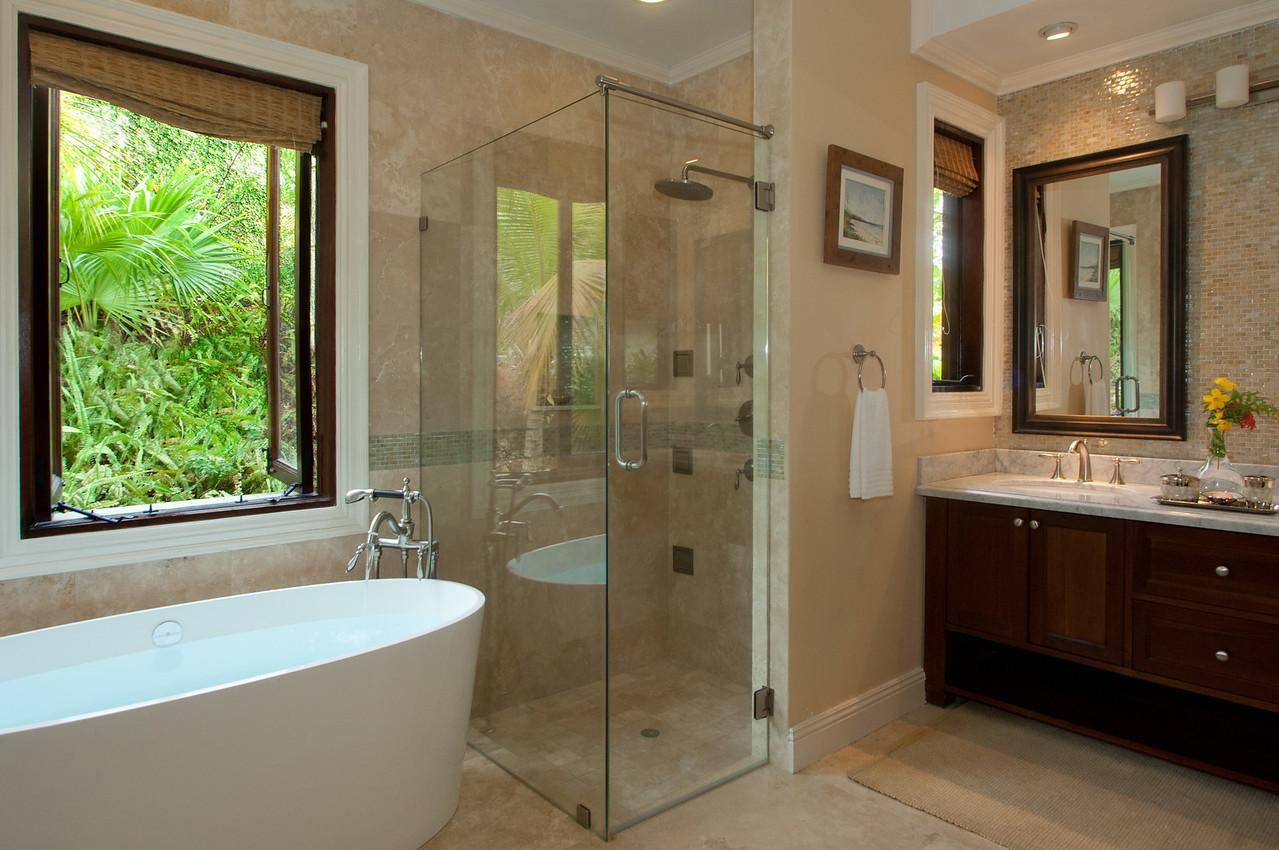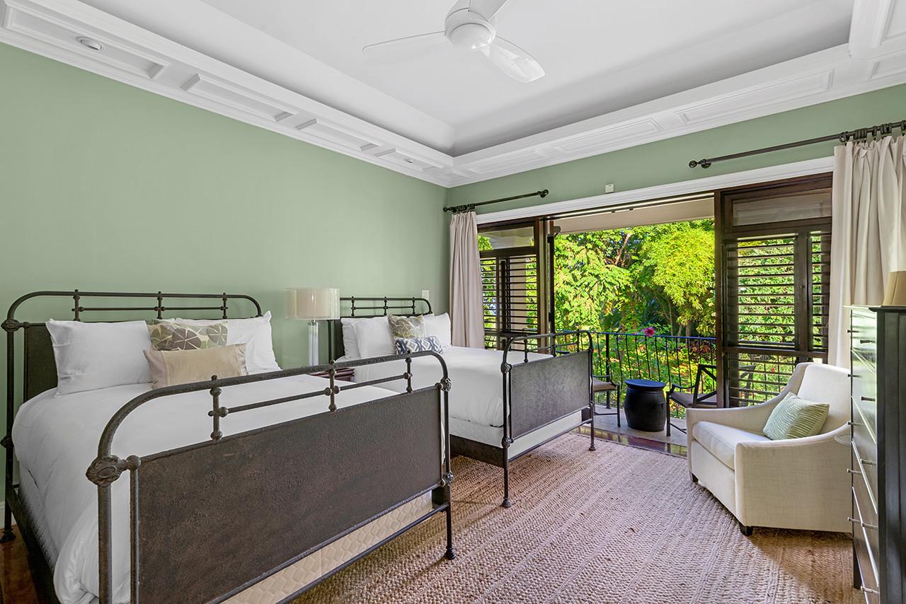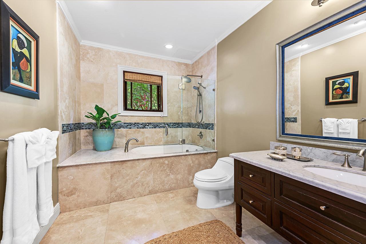• Bedroom 1: Primary with king bed, en suite bathroom with walk-in shower, ocean view, AC cable TV, surround-sound