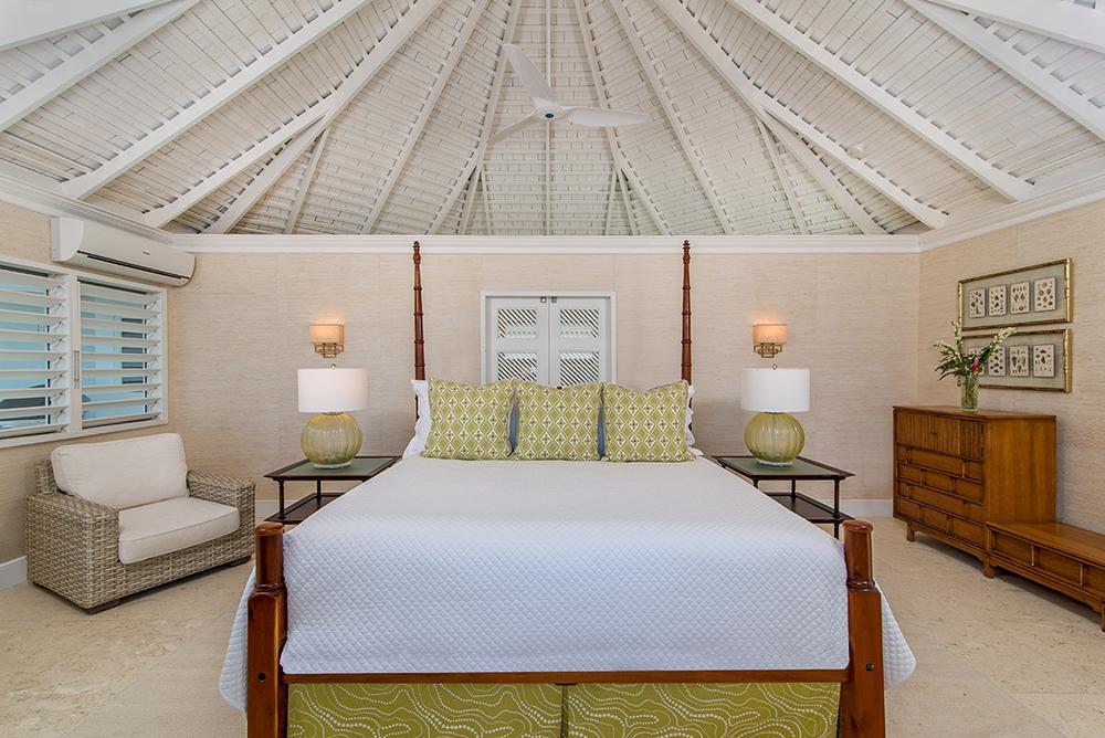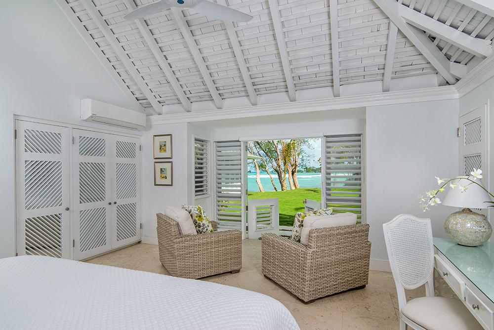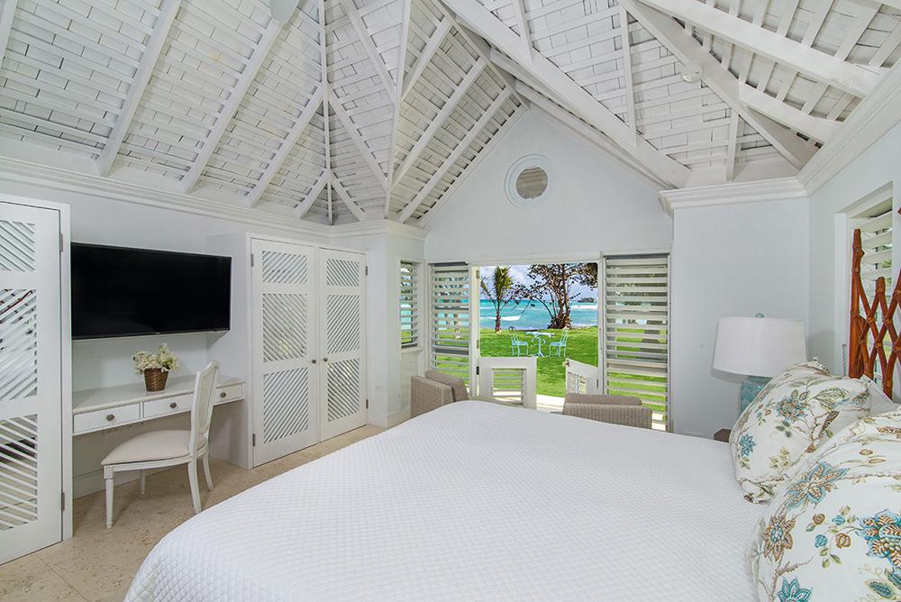 The Cottage (Bedroom 4): kingsize bed. 50-inch TV. En-suite bathroom with walk-in shower & open-air shower. Opens to pool terrace. This bedroom is in a separate octagonal cottage on the edge of the pool terrace and just 20 feet from the main house. Six French doors and 10 louvred windows open to a wonderful ocean view.