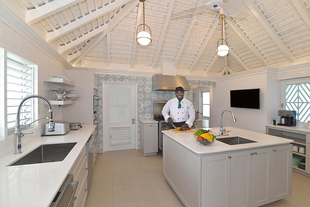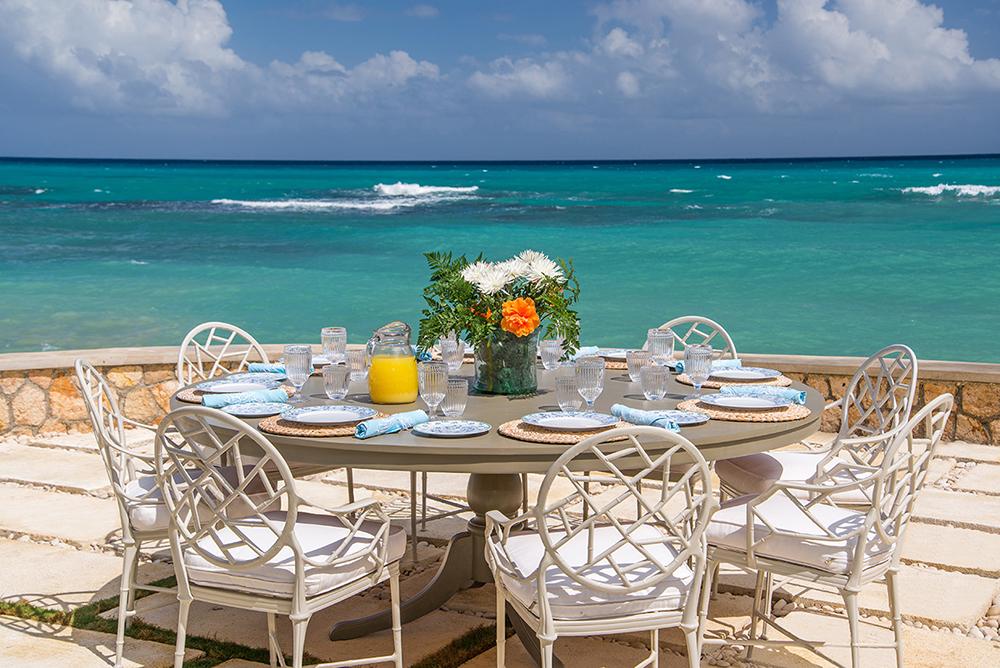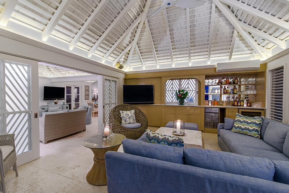 In the living room is the entertainment center with cable television, sound system and library of videos and CD's accent a 50-inch curved television. A wet bar adjoins the living room. Enter the media room through sliding pocket doors and enjoy an air-conditioned bar complete with another 75-inch curved television. Ten glass-paneled doors open from the living area to the spacious verandah and pool terrace, generously furnished with chaise lounges, tables and chairs. Stone steps lead from the terrace directly into the water. Most meals are served here on the breezy terrace near the sea. In addition to the outside dining table, Tradewinds also has an inside dining room with seating for ten under a whimsical chandelier. One wall of the dining room opens wide to a lush garden of tall tropical plants, beautifully lighted each night. A private pool terrace features a zero entry into a heated salt-water infinity pool complete with hot tub. Enjoy the loungers and thatched gazebo as you soak in the sun!
