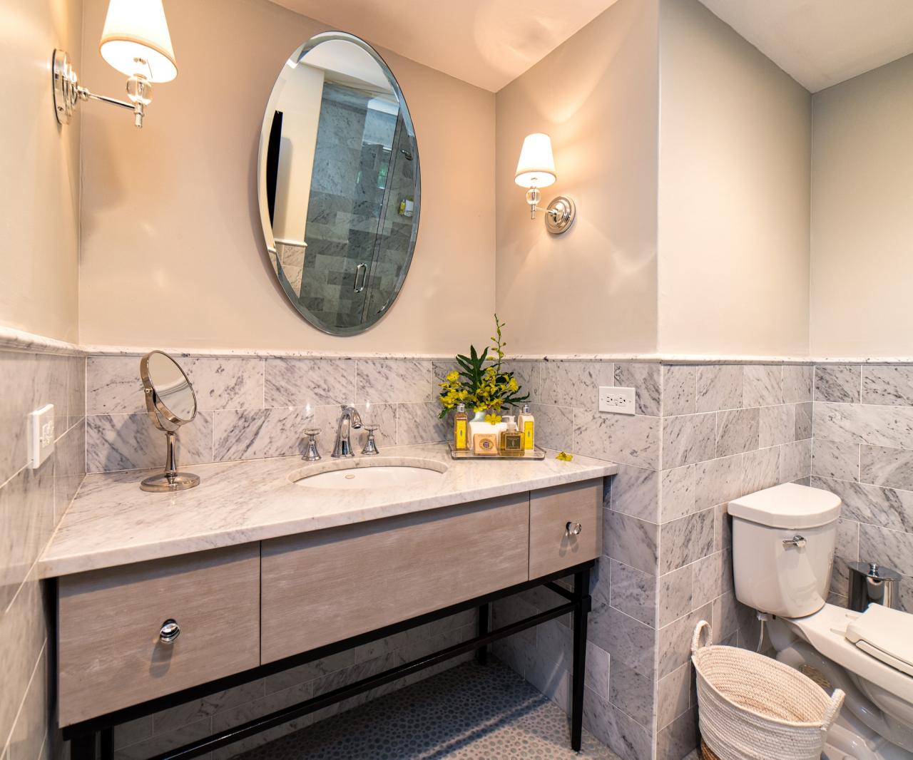 Bedroom 5: Queen bed, morning bar, refrigerator, en suite bathroom with twin vanities and walk-in shower, walk-in closet, private entrance, AC, ceiling fan, TV, bathrobes, safe