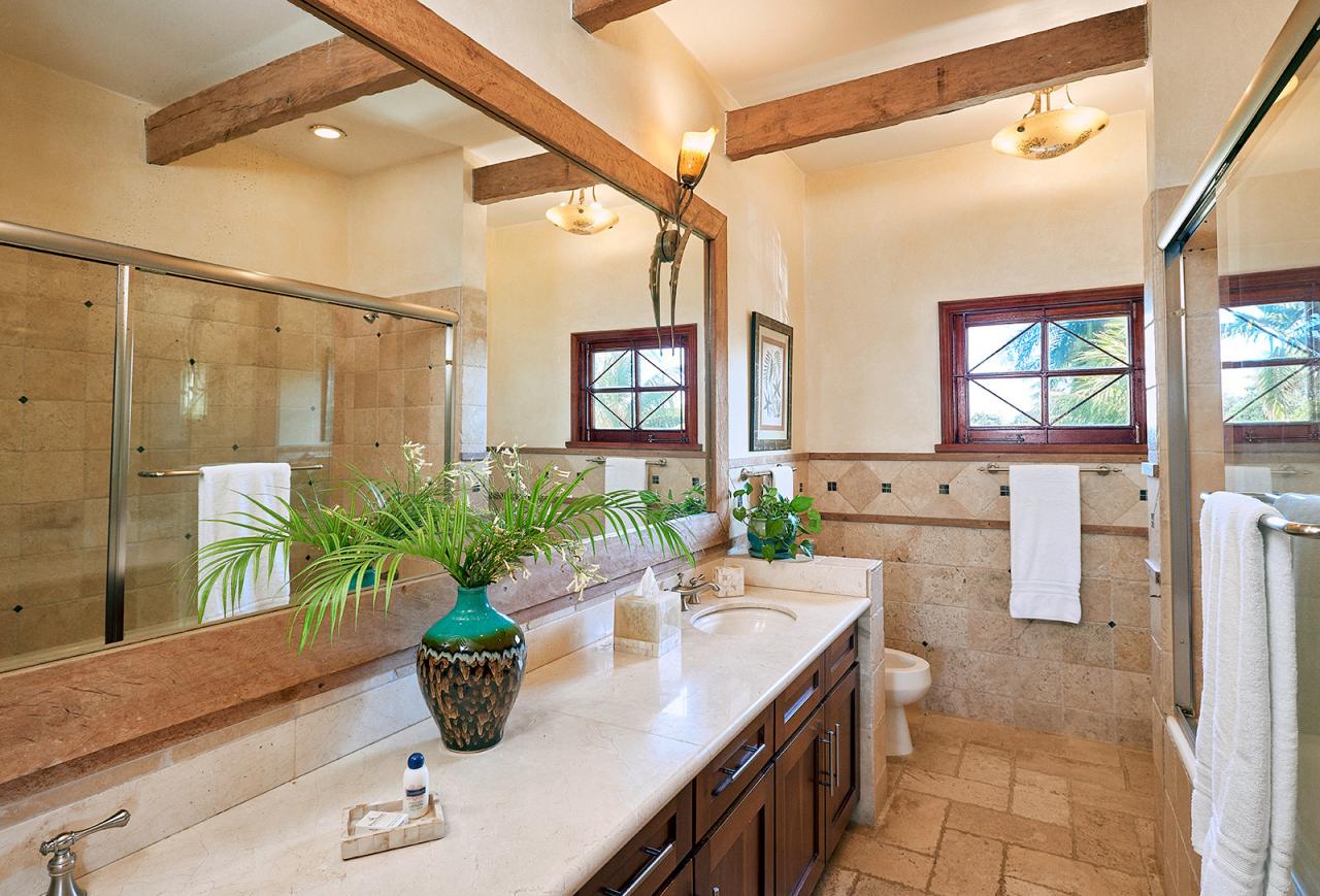 On the main level is the massive Great Room. French doors open wide to a large furnished verandah and bar. Just beyond are the private pool, Jacuzzi, shallow childrens pool, lawn, beach and bay. Upstairs is a second sitting room, entertainment center, Internet area and five of the seven bedrooms. Floors throughout are a combination of gleaming wood and imported stone.