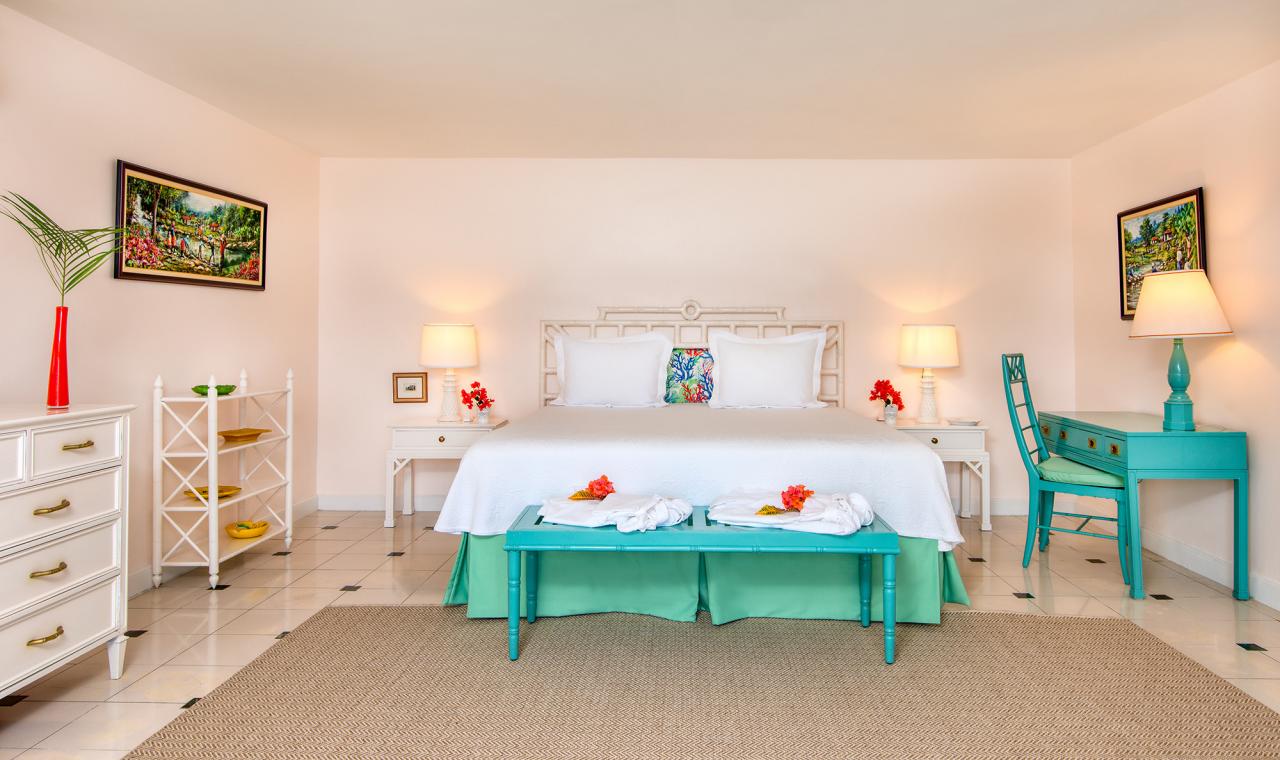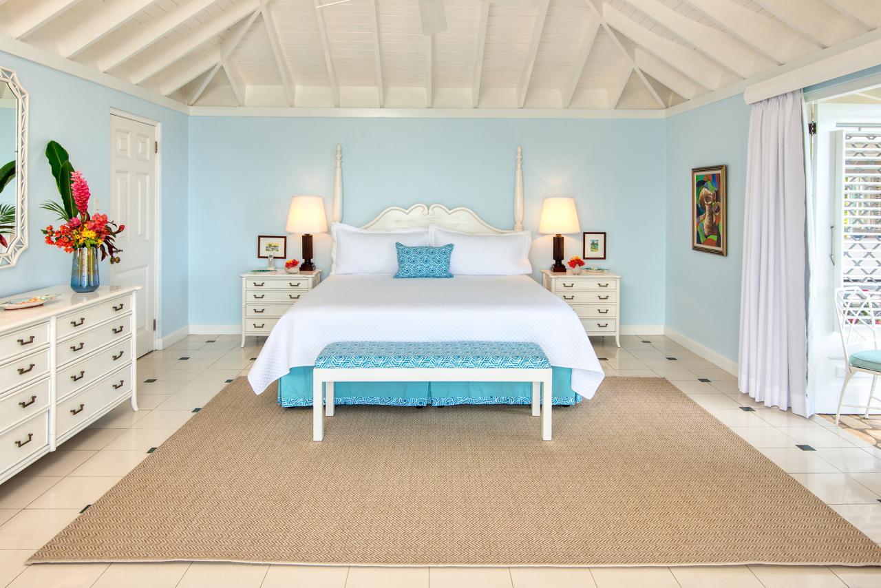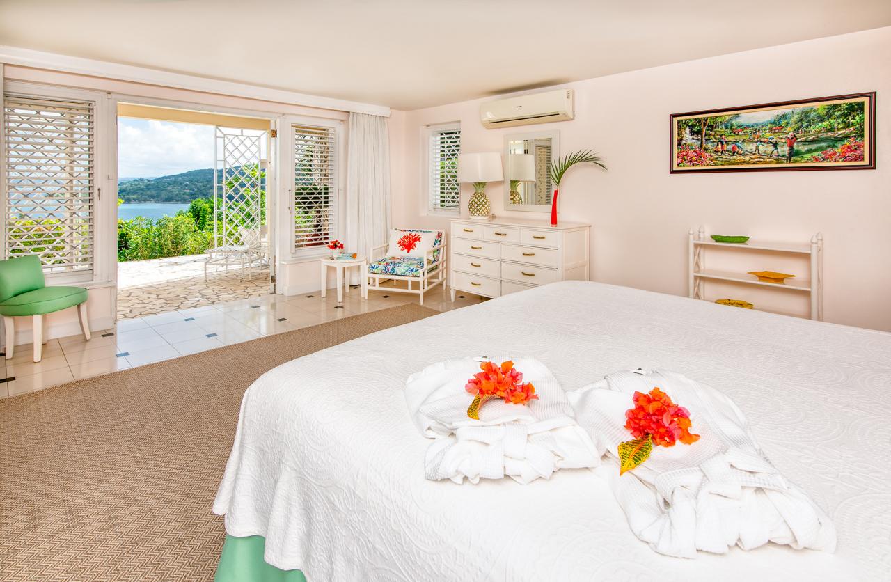 Bedroom 4: This room is equipped with the option of a king-sized bed or two twin-sized beds, a radio player, french doors to a private balcony with an ocean view, and an ensuite bathroom with a tub-shower combination.