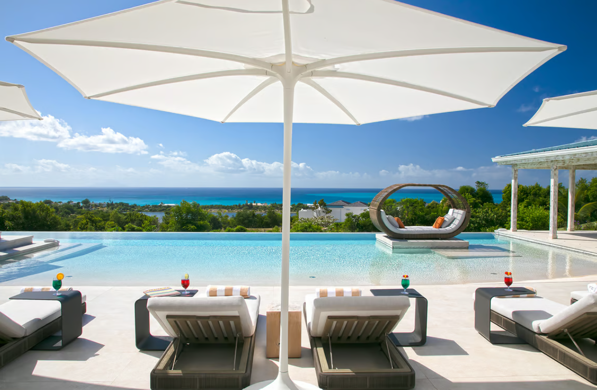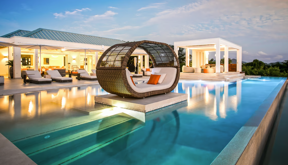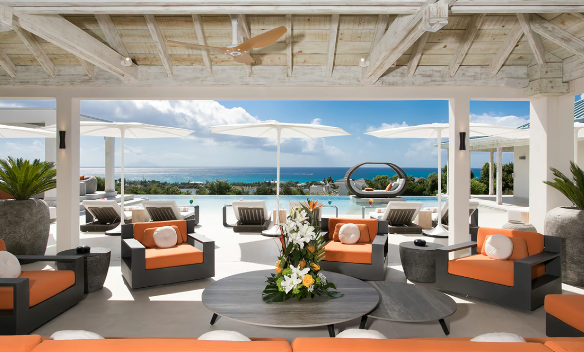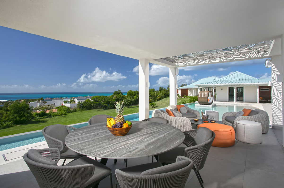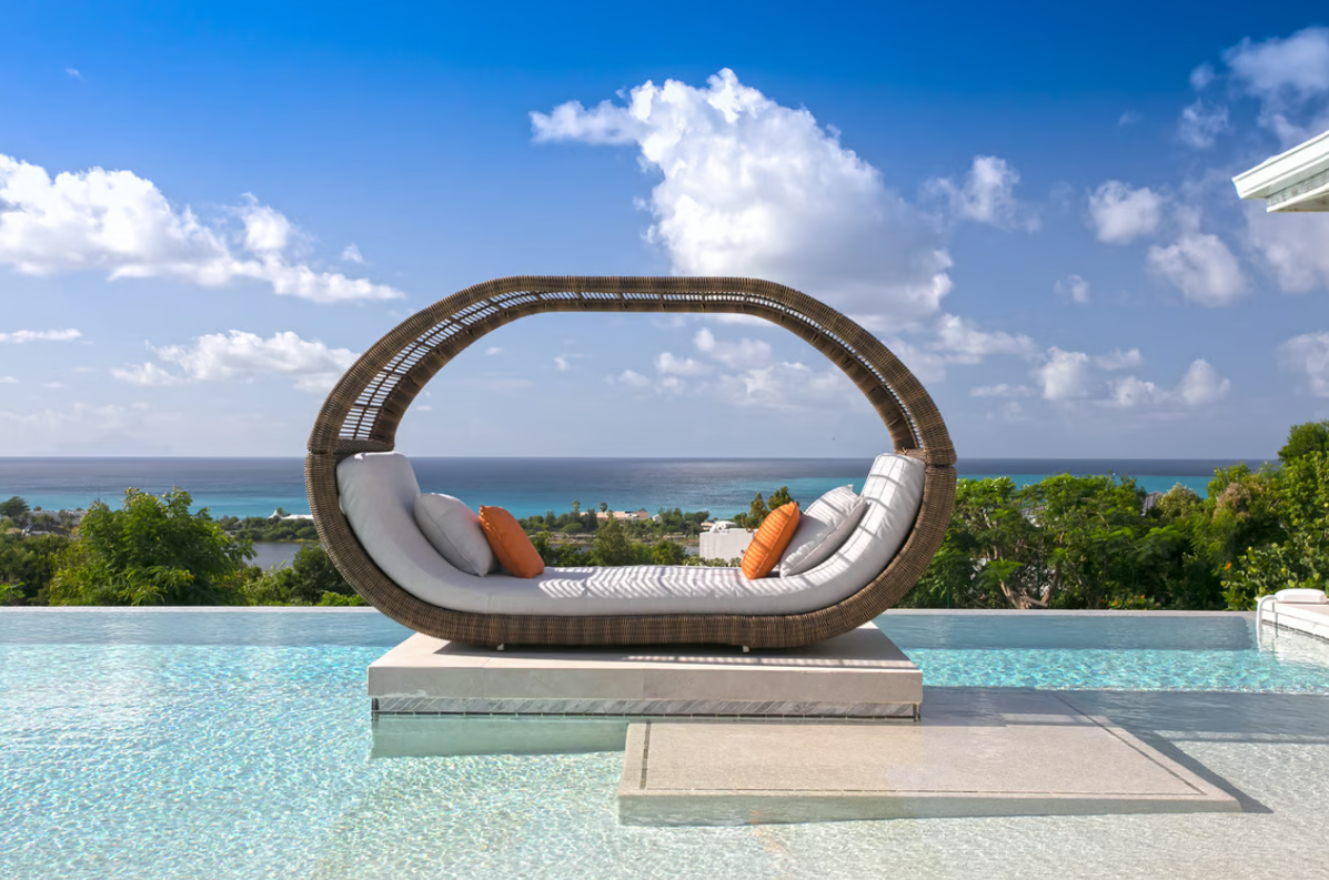 Experience the epitome of luxury at Avanti, a five-bedroom St Martin villa in Terres Basses that welcomes you with a palm tree-lined, gated driveway and stone fountains. The home features breathtaking 180-degree ocean views, a lush lawn, and an L-shaped saltwater pool with a built-in table, seating area, and "island" daybed.