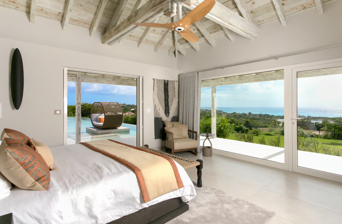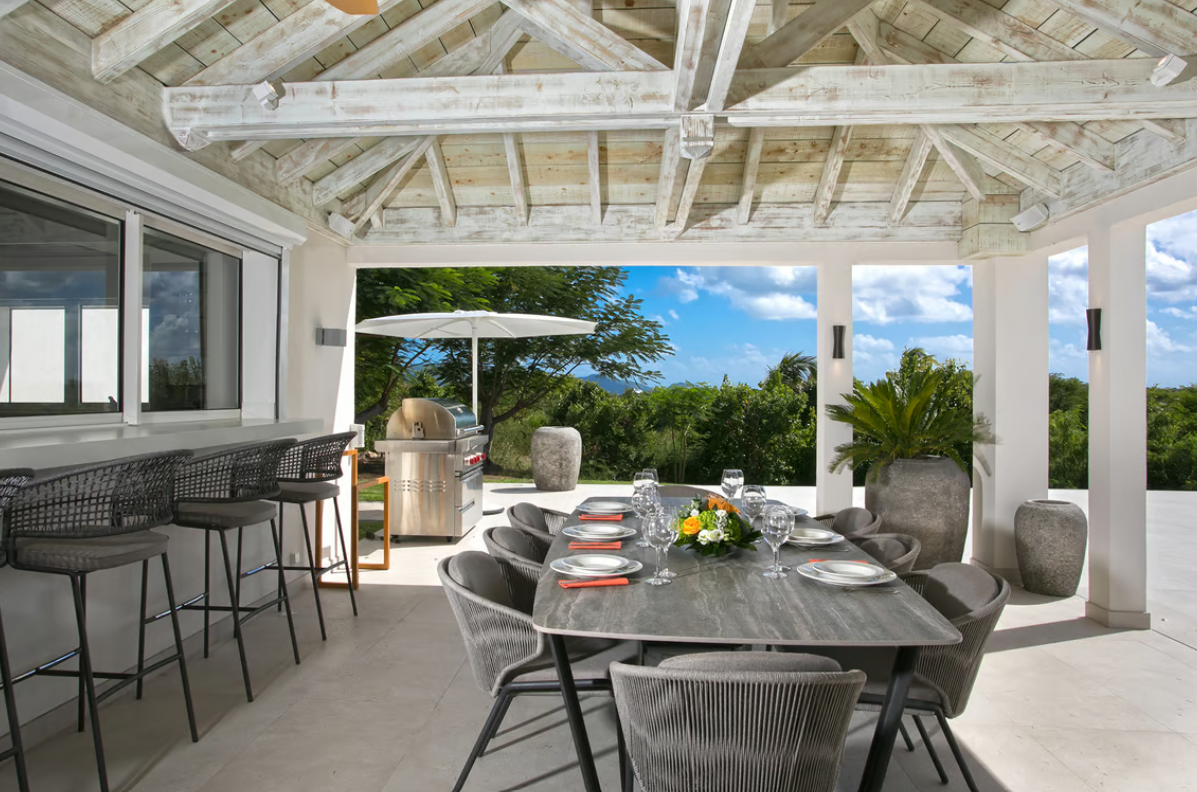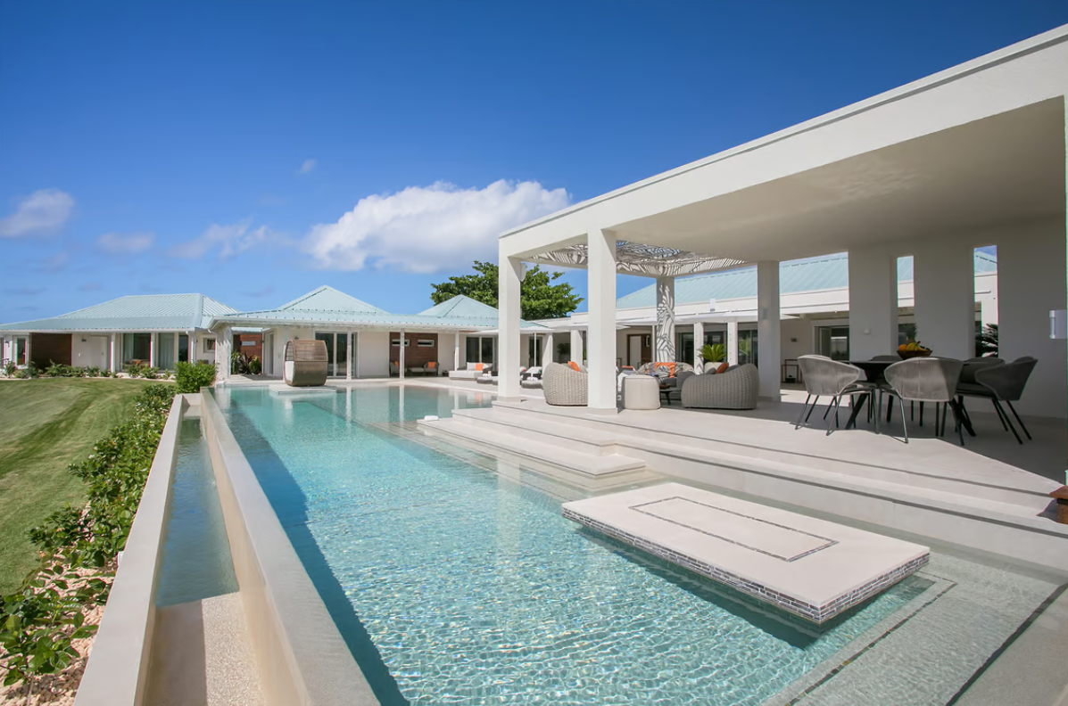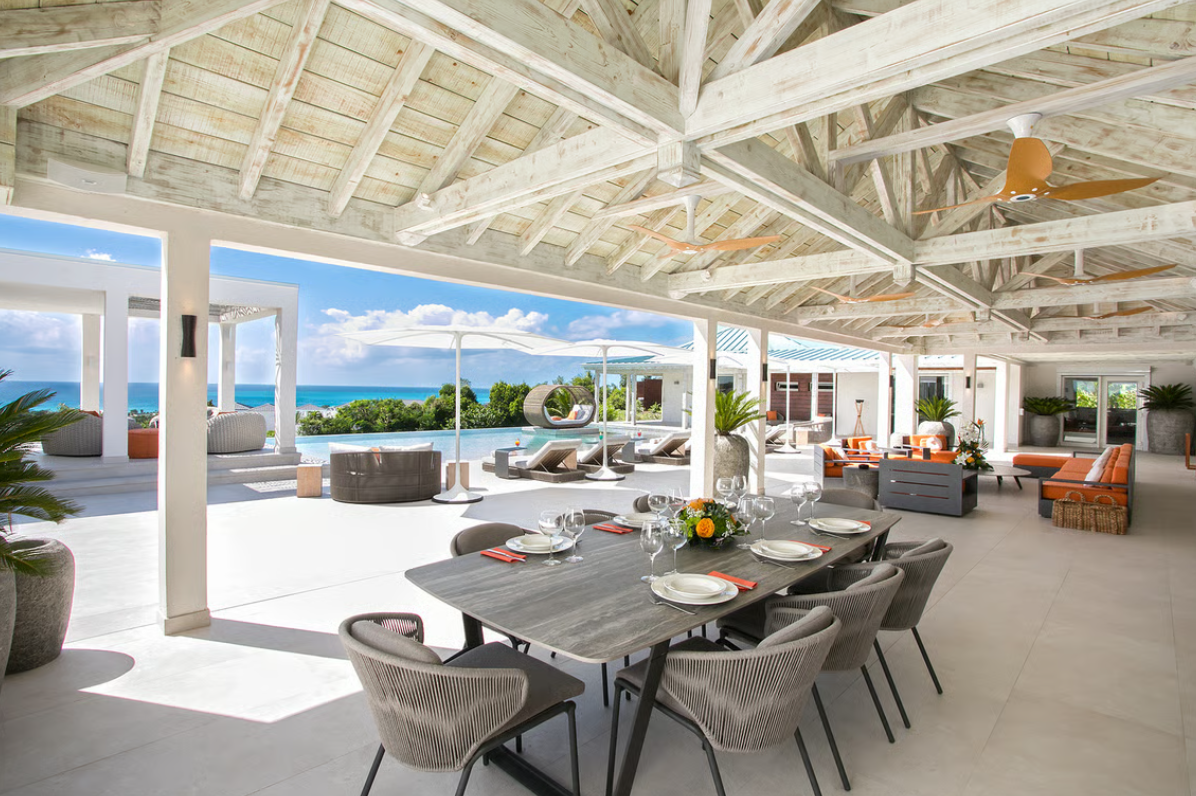 Experience the epitome of luxury at Avanti, a five-bedroom St Martin villa in Terres Basses that welcomes you with a palm tree-lined, gated driveway and stone fountains. The home features breathtaking 180-degree ocean views, a lush lawn, and an L-shaped saltwater pool with a built-in table, seating area, and "island" daybed.